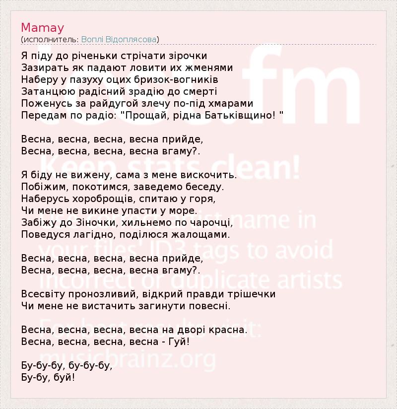 Я пiду до рiченьки стрiчати зiрочки Зазирать як падают ловити их жменями Наберу у пазуху оцих бризок-вогникiв Затанцюю радiсний зрадiю до смертi Поженусь за райдугой злечу по-пiд хмарами Передам по радiо: "Прощай, рiдна Батькiвщино! " Весна, весна, весна, весна прийде, Весна, весна, весна, весна вгаму?. Я бiду не вижену, сама з мене вискочить. Побiжим, покотимся, заведемо беседу. Наберусь хороброщiв, спитаю у горя, Чи мене не викине упасти у море. Забiжу до Зiночки, хильнемо по чарочцi, Поведуся лагiдно, подiлюся жалощами. Весна, весна, весна, весна прийде, Весна, весна, весна, весна вгаму?. Всесвiту пронозливий, вiдкрий правди трiшечки Чи мене не вистачить загинути повеснi. Весна, весна, весна, весна на дворi красна. Весна, весна, весна, весна - Гуй! Бу-бу-бу, бу-бу-бу, Бу-бу, буй!