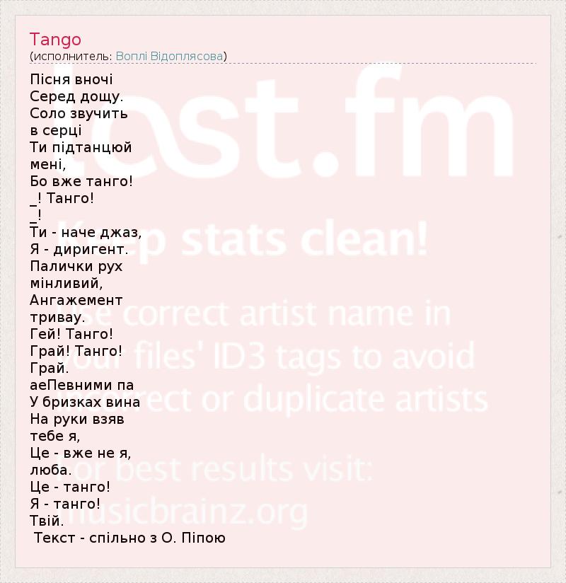 Пiсня вночi Серед дощу. Соло звучить в серцi Ти пiдтанцюй менi, Бо вже танго! _! Танго! _! Ти - наче джаз, Я - диригент. Палички рух мiнливий, Ангажемент тривау. Гей! Танго! Грай! Танго! Грай. aeПевними па У бризках вина На руки взяв тебе я, Це - вже не я, люба. Це - танго! Я - танго! Твiй. Текст - спiльно з О. Пiпою