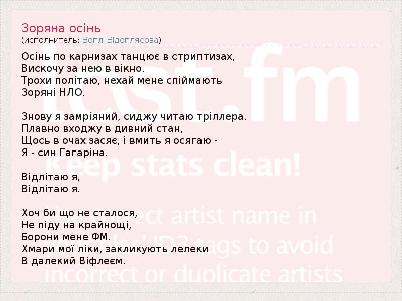 Это интересно:Неправильное название. Вместо кириллического "і", используется латинское. Правильное название: Воплі Відоплясова.Пожалуйста, исправьте это название на верное,нажав справа внизу на кнопку "Предложи правильный вариант",и изменив текущее название на правильное,а именно: Воплі Відоплясова.... продолжение
