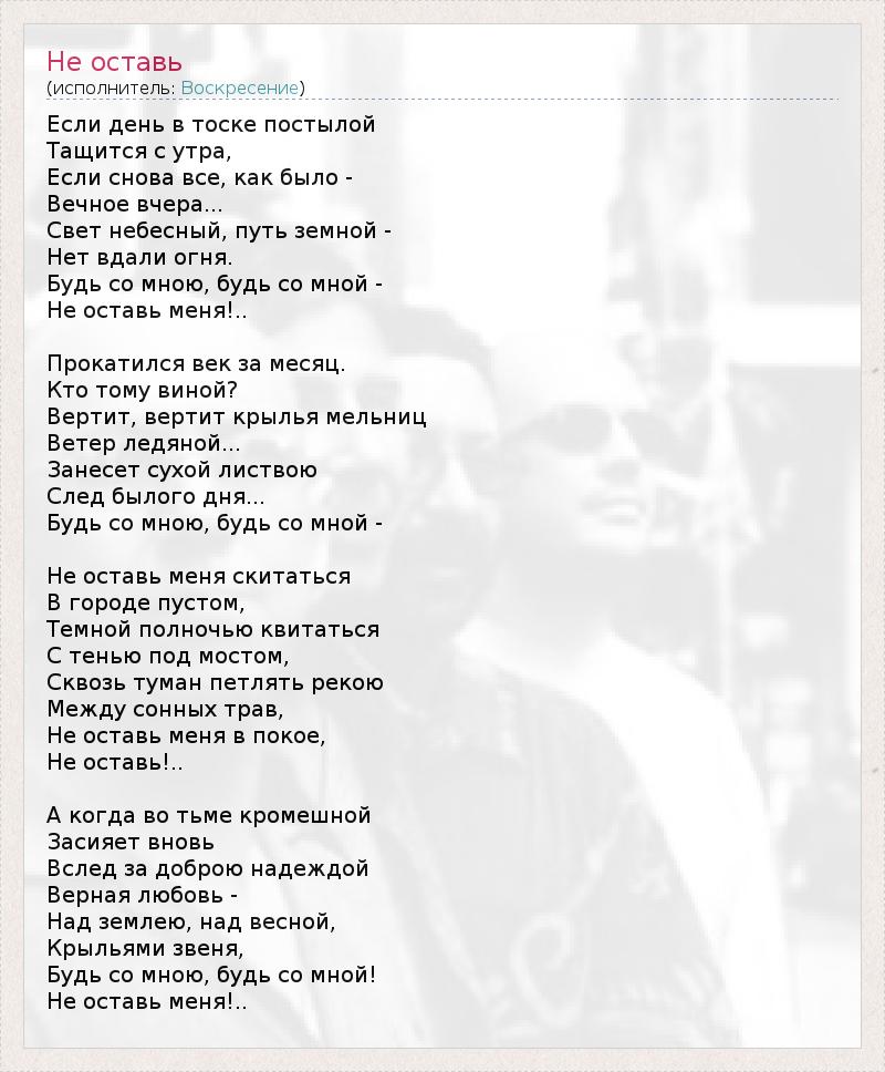 Если день в тоске постылой Тащится с утра, Если снова все, как было - Вечное вчера... Свет небесный, путь земной - Нет вдали огня. Будь со мною, будь со мной - Не оставь меня!.. Прокатился век за месяц. Кто тому виной? Вертит, вертит крылья мельниц Ветер ледяной... Занесет сухой листвою След былого дня... Будь со мною, будь со мной - Не оставь меня скитаться В городе пустом, Темной полночью квитаться С тенью под мостом, Сквозь туман петлять рекою Между сонных трав, Не оставь меня в покое, Не оставь!.. А когда во тьме кромешной Засияет вновь Вслед за доброю надеждой Верная любовь - Над землею, над весной, Крыльями звеня, Будь со мною, будь со мной! Не оставь меня!..