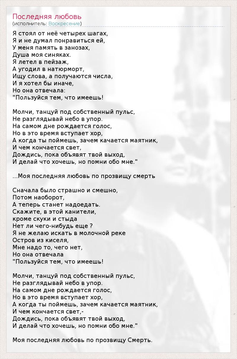 Я стоял от неё четырех шагах, Я и не думал понравиться ей, У меня память в занозах, Душа моя синяках. Я летел в пейзаж, А угодил в натюрморт, Ищу слова, а получаются числа, И я хотел бы иначе, Но она отвечала: "Пользуйся тем, что имеешь! Молчи, танцуй под собственный пульс, Не разглядывай небо в упор. На самом дне рождается голос, Но в это время вступает хор, А когда ты поймешь, зачем качается маятник, И чем кончается свет, Дождись, пока объявят твой выход, И делай что хочешь, но помни обо мне." ...Моя последняя любовь по прозвищу смерть Сначала было страшно и смешно, Потом наоборот, А теперь станет надоедать. Скажите, в этой канители, кроме скуки и стыда Нет ли чего-нибудь еще ? Я не желаю искать в молочной реке Остров из киселя, Мне надо то, чего нет, Но она отвечала "Пользуйся тем, что имеешь! Молчи, танцуй под собственный пульс, Не разглядывай небо в упор. На самом дне рождается голос, Но в это время вступает хор, А когда ты поймешь, зачем качается маятник, И чем кончается свет,- Дождись, пока объявят твой выход, И делай что хочешь, но помни обо мне." Моя последняя любовь по прозвищу Смерть.