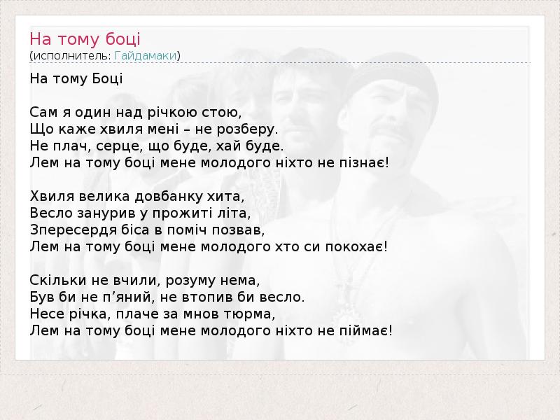 At that Botsі I myself am one of rіchkoyu stand , Scho Kazhe hvilya Meni - not Rosebery . Do not cry , sertce scho bude , bude high . Lem on to botsі mene young nіhto not pіznaє ! Hvilya dovbanku great hit Paddle zanuriv have prozhitі lіta , Zpereserdya bіsa in pomіch called, Lem on to botsі young hto mene si pokohaє ! Skіlki not vchili , Rozum dumb CCB is not bi p'yany not vtopiv bi paddle. Nese rіchka , weeping for mnov jails , Lem on to botsі mene young nіhto not pіymaє !