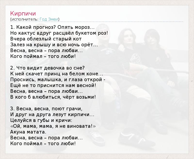 1. Какой прогноз? Опять мороз… Но кактус вдруг расцвёл букетом роз! Вчера облезлый старый кот Залез на крышу и всю ночь орёт… Весна, весна – пора любви… Кого поймал – того люби! 2. Что видит девочка во сне? К ней скачет принц на белом коне… Проснись, малышка, и глаза открой - Ещё не то приснится нам весной! Весна, весна – пора любви… В кого б влюбиться, чёрт возьми! 3. Весна, весна, поют грачи, И друг на друга лезут кирпичи… Целуйся в губы и кричи: «Ой, мама, мама, я не виновата!» Акуна матата. Весна, весна – пора любви… Кого поймал – того люби!