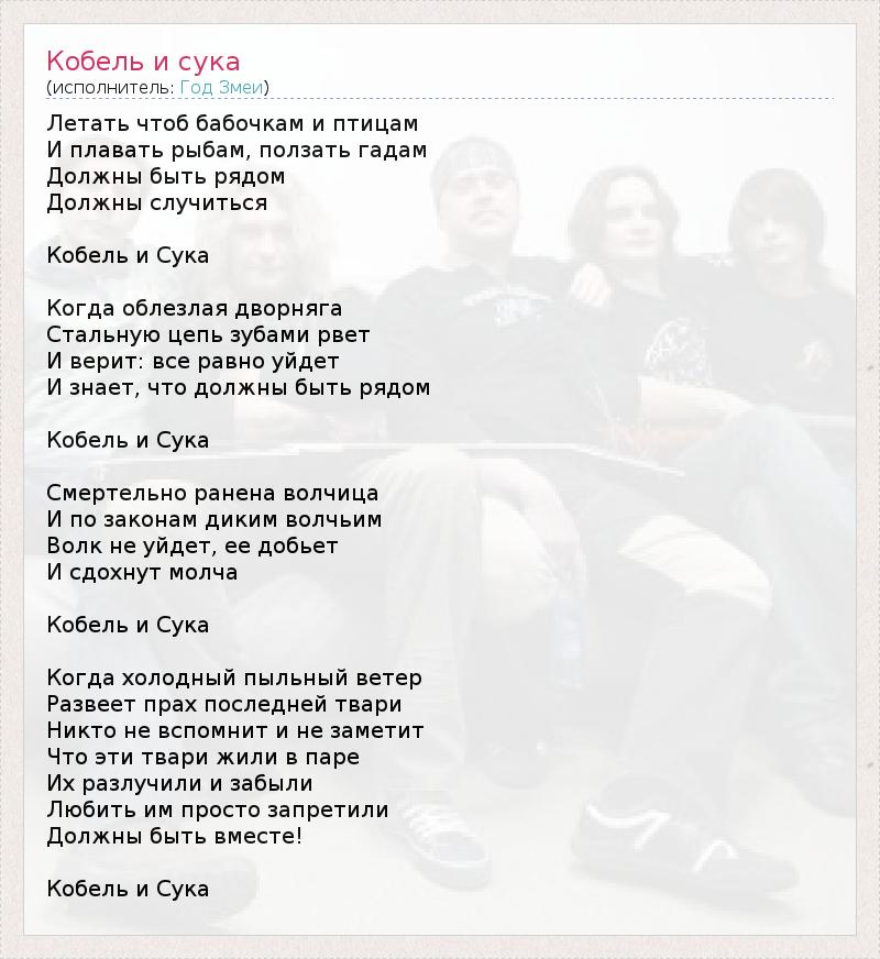 Летать чтоб бабочкам и птицам И плавать рыбам, ползать гадам Должны быть рядом Должны случиться Кобель и Сука Когда облезлая дворняга Стальную цепь зубами рвет И верит: все равно уйдет И знает, что должны быть рядом Кобель и Сука Смертельно ранена волчица И по законам диким волчьим Волк не уйдет, ее добьет И сдохнут молча Кобель и Сука Когда холодный пыльный ветер Развеет прах последней твари Никто не вспомнит и не заметит Что эти твари жили в паре Их разлучили и забыли Любить им просто запретили Должны быть вместе! Кобель и Сука