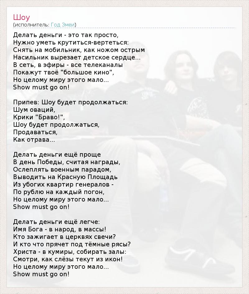 Делать деньги - это так просто, Нужно уметь крутиться-вертеться: Снять на мобильник, как ножом острым Насильник вырезает детское сердце... В сеть, в эфиры - все телеканалы Покажут твоё "большое кино", Но целому миру этого мало... Show must go on! Припев: Шоу будет продолжаться: Шум оваций, Крики "Браво!", Шоу будет продолжаться, Продаваться, Как отрава... Делать деньги ещё проще В день Победы, считая награды, Ослеплять военным парадом, Выводить на Красную Площадь Из убогих квартир генералов - По рублю на каждый погон, Но целому миру этого мало... Show must go on! Делать деньги ещё легче: Имя Бога - в народ, в массы! Кто зажигает в церквях свечи? И кто что прячет под тёмные рясы? Христа - в кумиры, собирать залы: Смотри, как слёзы текут из икон! Но целому миру этого мало... Show must go on!