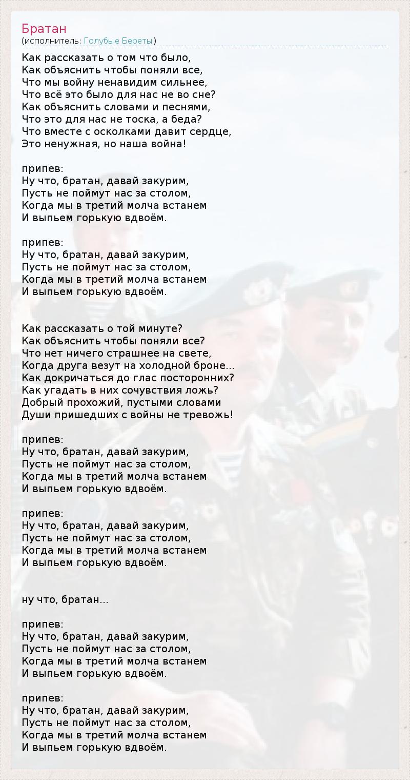 Это интересно:Отдельный концертный ансамбль Воздушно-десантных войск России «Голубые береты»Ансамбль «Голубые береты» начал свою творческую жизнь самодеятельным коллективом воинов-десантников 350-го ПДП 103-й Воздушно-десантной дивизии в 1985 году в Афганистане.Все участники группы были награждены орденами и медалями за участие в боевых действиях. С первого концерта, который состоялся... продолжение