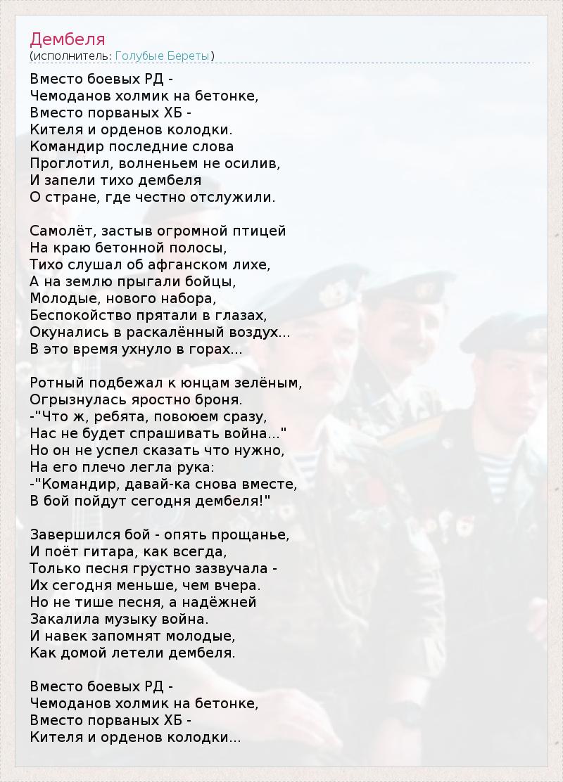 Вместо боевых РД - Чемоданов холмик на бетонке, Вместо порваных ХБ - Кителя и орденов колодки. Командир последние слова Проглотил, волненьем не осилив, И запели тихо дембеля О стране, где честно отслужили. Самолёт, застыв огромной птицей На краю бетонной полосы, Тихо слушал об афганском лихе, А на землю прыгали бойцы, Молодые, нового набора, Беспокойство прятали в глазах, Окунались в раскалённый воздух... В это время ухнуло в горах... Ротный подбежал к юнцам зелёным, Огрызнулась яростно броня. -"Что ж, ребята, повоюем сразу, Нас не будет спрашивать война..." Но он не успел сказать что нужно, На его плечо легла рука: -"Командир, давай-ка снова вместе, В бой пойдут сегодня дембеля!" Завершился бой - опять прощанье, И поёт гитара, как всегда, Только песня грустно зазвучала - Их сегодня меньше, чем вчера. Но не тише песня, а надёжней Закалила музыку война. И навек запомнят молодые, Как домой летели дембеля. Вместо боевых РД - Чемоданов холмик на бетонке, Вместо порваных ХБ - Кителя и орденов колодки...