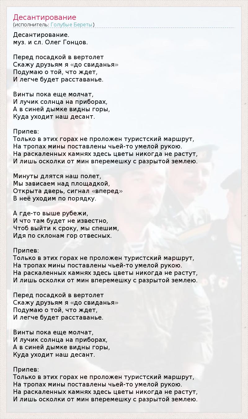Это интересно:Отдельный концертный ансамбль Воздушно-десантных войск России «Голубые береты»Ансамбль «Голубые береты» начал свою творческую жизнь самодеятельным коллективом воинов-десантников 350-го ПДП 103-й Воздушно-десантной дивизии в 1985 году в Афганистане.Все участники группы были награждены орденами и медалями за участие в боевых действиях. С первого концерта, который состоялся... продолжение