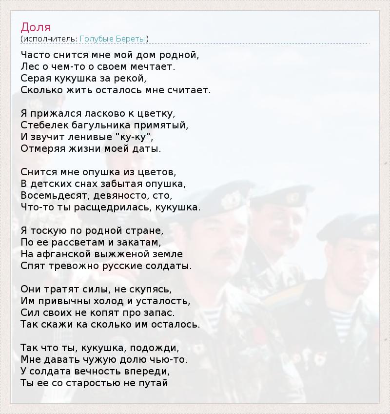 Это интересно:Отдельный концертный ансамбль Воздушно-десантных войск России «Голубые береты»Ансамбль «Голубые береты» начал свою творческую жизнь самодеятельным коллективом воинов-десантников 350-го ПДП 103-й Воздушно-десантной дивизии в 1985 году в Афганистане.Все участники группы были награждены орденами и медалями за участие в боевых действиях. С первого концерта, который состоялся... продолжение