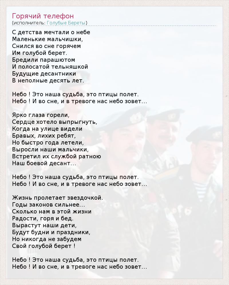 Это интересно:Отдельный концертный ансамбль Воздушно-десантных войск России «Голубые береты»Ансамбль «Голубые береты» начал свою творческую жизнь самодеятельным коллективом воинов-десантников 350-го ПДП 103-й Воздушно-десантной дивизии в 1985 году в Афганистане.Все участники группы были награждены орденами и медалями за участие в боевых действиях. С первого концерта, который состоялся... продолжение