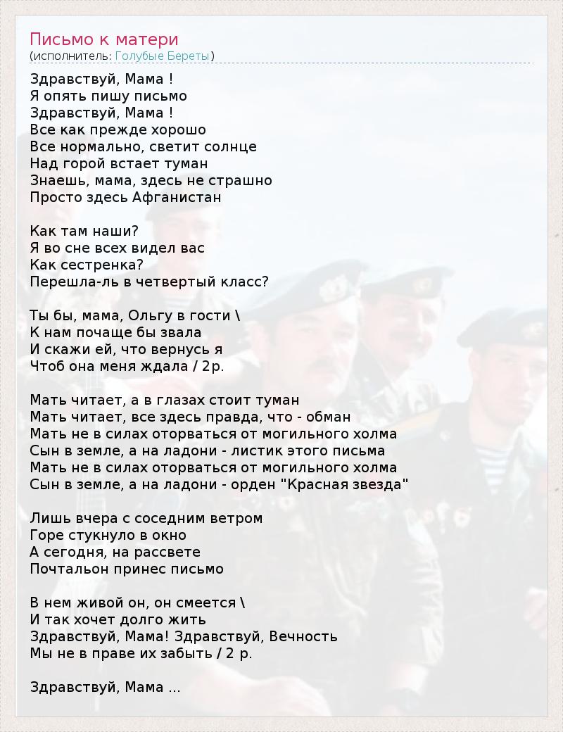 Здравствуй, Мама ! Я опять пишу письмо Здравствуй, Мама ! Все как прежде хорошо Все нормально, светит солнце Над горой встает туман Знаешь, мама, здесь не страшно Просто здесь Афганистан Как там наши? Я во сне всех видел вас Как сестренка? Перешла-ль в четвертый класс? Ты бы, мама, Ольгу в гости \ К нам почаще бы звала И скажи ей, что вернусь я Чтоб она меня ждала / 2р. Мать читает, а в глазах стоит туман Мать читает, все здесь правда, что - обман Мать не в силах оторваться от могильного холма Сын в земле, а на ладони - листик этого письма Мать не в силах оторваться от могильного холма Сын в земле, а на ладони - орден "Красная звезда" Лишь вчера с соседним ветром Горе стукнуло в окно А сегодня, на рассвете Почтальон принес письмо В нем живой он, он смеется \ И так хочет долго жить Здравствуй, Мама! Здравствуй, Вечность Мы не в праве их забыть / 2 р. Здравствуй, Мама ...