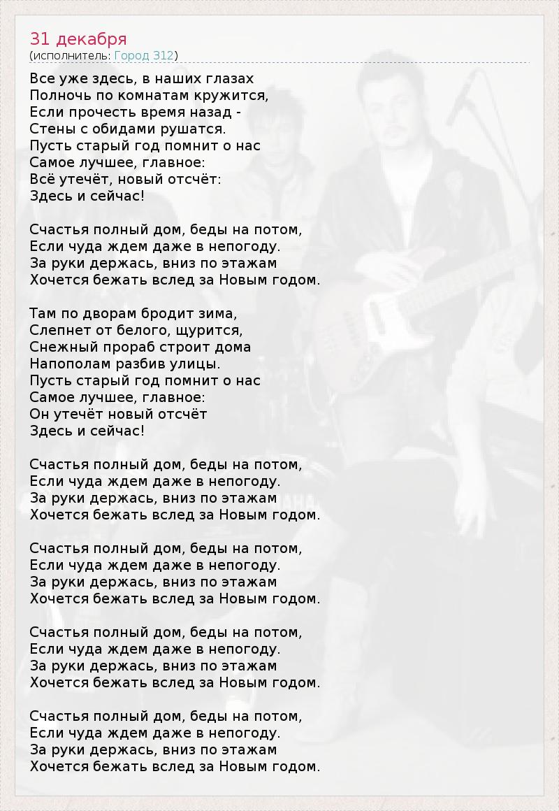 Все уже здесь, в наших глазах Полночь по комнатам кружится, Если прочесть время назад - Стены с обидами рушатся. Пусть старый год помнит о нас Самое лучшее, главное: Всё утечёт, новый отсчёт: Здесь и сейчас! Счастья полный дом, беды на потом, Если чуда ждем даже в непогоду. За руки держась, вниз по этажам Хочется бежать вслед за Новым годом. Там по дворам бродит зима, Слепнет от белого, щурится, Снежный прораб строит дома Напополам разбив улицы. Пусть старый год помнит о нас Самое лучшее, главное: Он утечёт новый отсчёт Здесь и сейчас! Счастья полный дом, беды на потом, Если чуда ждем даже в непогоду. За руки держась, вниз по этажам Хочется бежать вслед за Новым годом. Счастья полный дом, беды на потом, Если чуда ждем даже в непогоду. За руки держась, вниз по этажам Хочется бежать вслед за Новым годом. Счастья полный дом, беды на потом, Если чуда ждем даже в непогоду. За руки держась, вниз по этажам Хочется бежать вслед за Новым годом. Счастья полный дом, беды на потом, Если чуда ждем даже в непогоду. За руки держась, вниз по этажам Хочется бежать вслед за Новым годом.