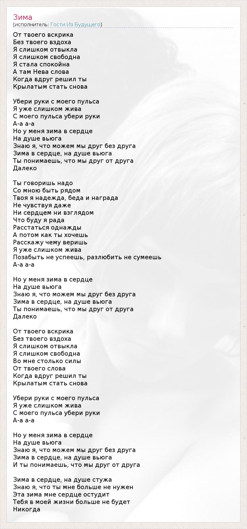 От твоего вскрика Без твоего вздоха Я слишком отвыкла Я слишком свободна Я стала спокойна А там Нева слова Когда вдруг решил ты Крылатым стать снова Убери руки с моего пульса Я уже слишком жива С моего пульса убери руки А-а а-а Но у меня зима в сердце На душе вьюга Знаю я, что можем мы друг без друга Зима в сердце, на душе вьюга Ты понимаешь, что мы друг от друга Далеко Ты говоришь надо Со мною быть рядом Твоя я надежда, беда и награда Не чувствуя даже Ни сердцем ни взглядом Что буду я рада Расстаться однажды А потом как ты хочешь Расскажу чему веришь Я уже слишком жива Позабыть не успеешь, разлюбить не сумеешь А-а а-а Но у меня зима в сердце На душе вьюга Знаю я, что можем мы друг без друга Зима в сердце, на душе вьюга Ты понимаешь, что мы друг от друга Далеко От твоего вскрика Без твоего вздоха Я слишком отвыкла Я слишком свободна Во мне столько силы От твоего слова Когда вдруг решил ты Крылатым стать снова Убери руки с моего пульса Я уже слишком жива С моего пульса убери руки А-а а-а Но у меня зима в сердце На душе вьюга Знаю я, что можем мы друг без друга Зима в сердце, на душе вьюга И ты понимаешь, что мы друг от друга Зима в сердце, на душе стужа Знаю я, что ты мне больше не нужен Эта зима мне сердце остудит Тебя в моей жизни больше не будет Никогда
