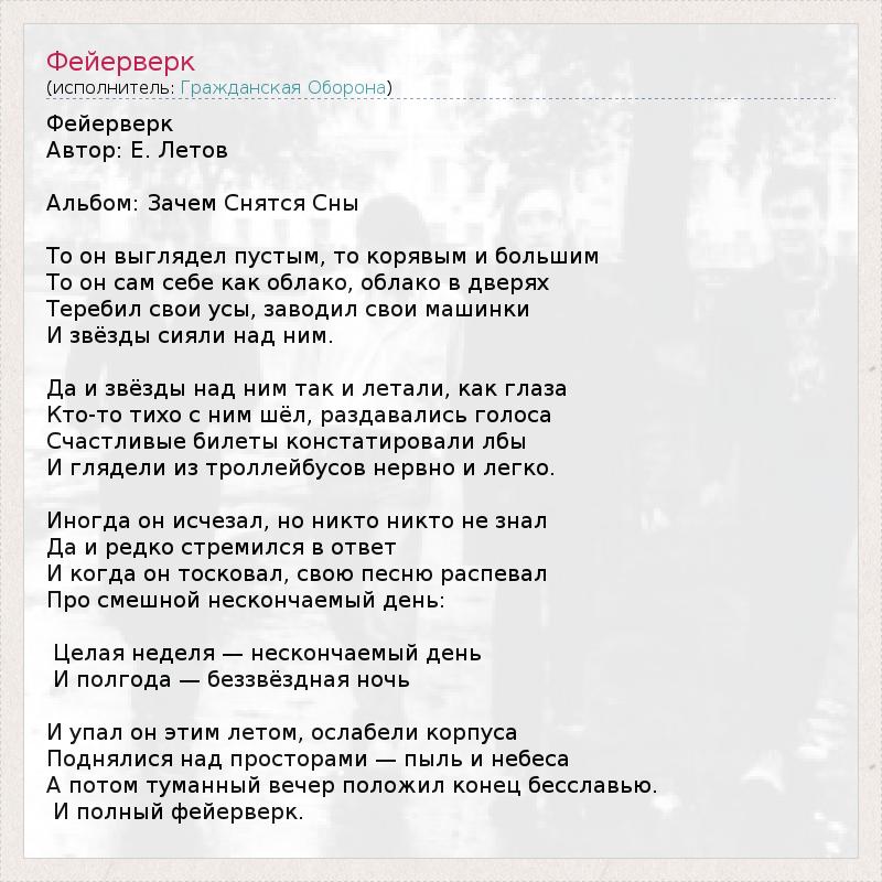 Это интересно:«Гражданская оборона» — российская рок-группа. Основатель, бессмертный лидер и единственный постоянный участник группы — Игорь (Егор) Фёдорович Летов. Группа основана Летовым и Константином Рябиновым (Кузя Уо) в городе Омске 8 ноября 1984 года.Появлению «Гражданской обороны» предшествовала деятельность Егора Летова и его единомышленников в рамках проекта «Посев», в котором делались... продолжение