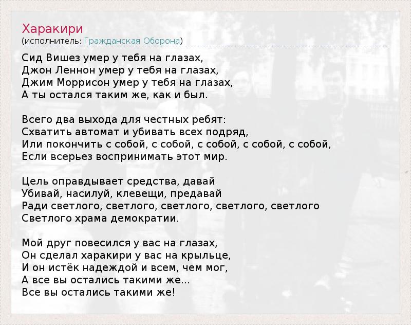 Это интересно:«Гражданская оборона» — российская рок-группа. Основатель, бессмертный лидер и единственный постоянный участник группы — Игорь (Егор) Фёдорович Летов. Группа основана Летовым и Константином Рябиновым (Кузя Уо) в городе Омске 8 ноября 1984 года.Появлению «Гражданской обороны» предшествовала деятельность Егора Летова и его единомышленников в рамках проекта «Посев», в котором делались... продолжение