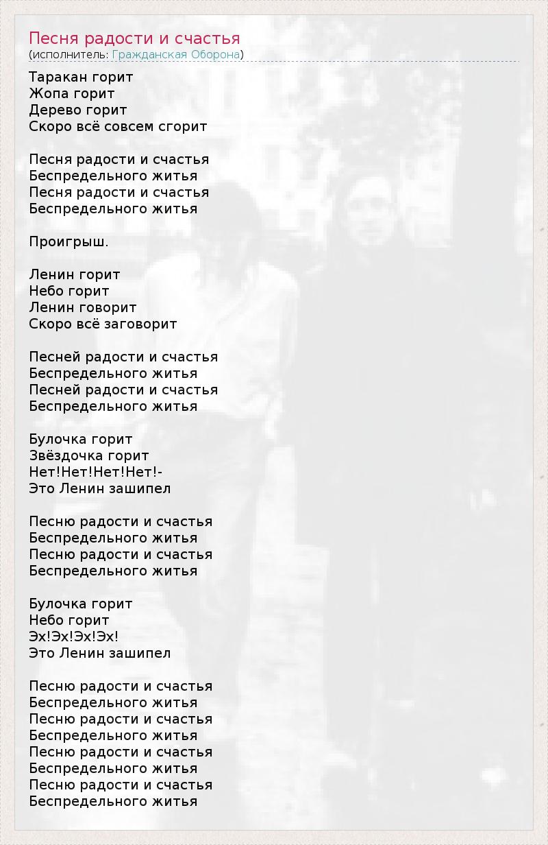Таракан горит Жопа горит Дерево горит Скоро всё совсем сгорит Песня радости и счастья Беспредельного житья Песня радости и счастья Беспредельного житья Проигрыш. Ленин горит Небо горит Ленин говорит Скоро всё заговорит Песней радости и счастья Беспредельного житья Песней радости и счастья Беспредельного житья Булочка горит Звёздочка горит Нет!Нет!Нет!Нет!- Это Ленин зашипел Песню радости и счастья Беспредельного житья Песню радости и счастья Беспредельного житья Булочка горит Небо горит Эх!Эх!Эх!Эх! Это Ленин зашипел Песню радости и счастья Беспредельного житья Песню радости и счастья Беспредельного житья Песню радости и счастья Беспредельного житья Песню радости и счастья Беспредельного житья