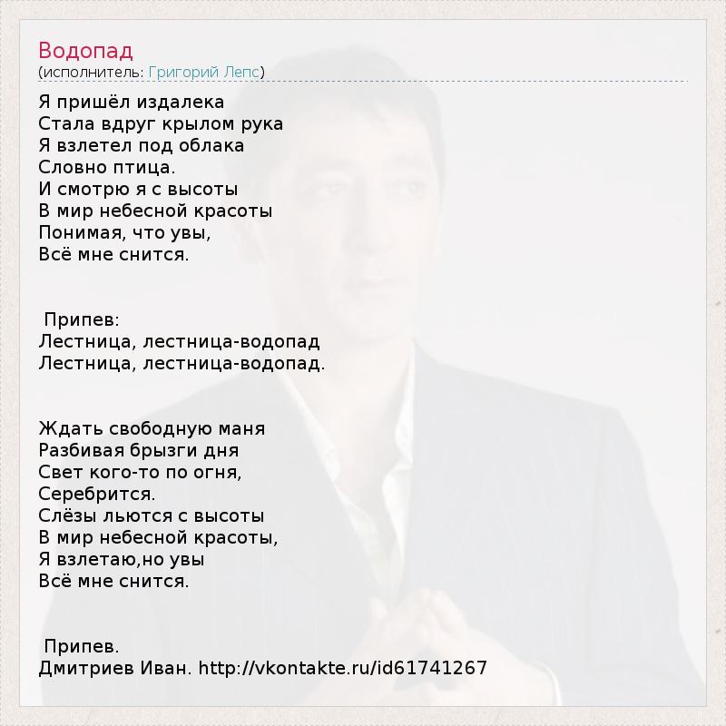 Это интересно:Григорий Лепc (настоящее имя — Григорий Викторович Лепсверидзе; 16 июля 1962, Сочи) — российский артист-вокалист грузинского происхождения, автор нескольких собственных песен, продюсер, член Международного союза деятелей эстрадного искусства (творческого союза), заслуженный артист РФ (2011).БиографияОтец Григория Лепса, Виктор Антонович работал на Сочинском мясокомбинате, мать,... продолжение