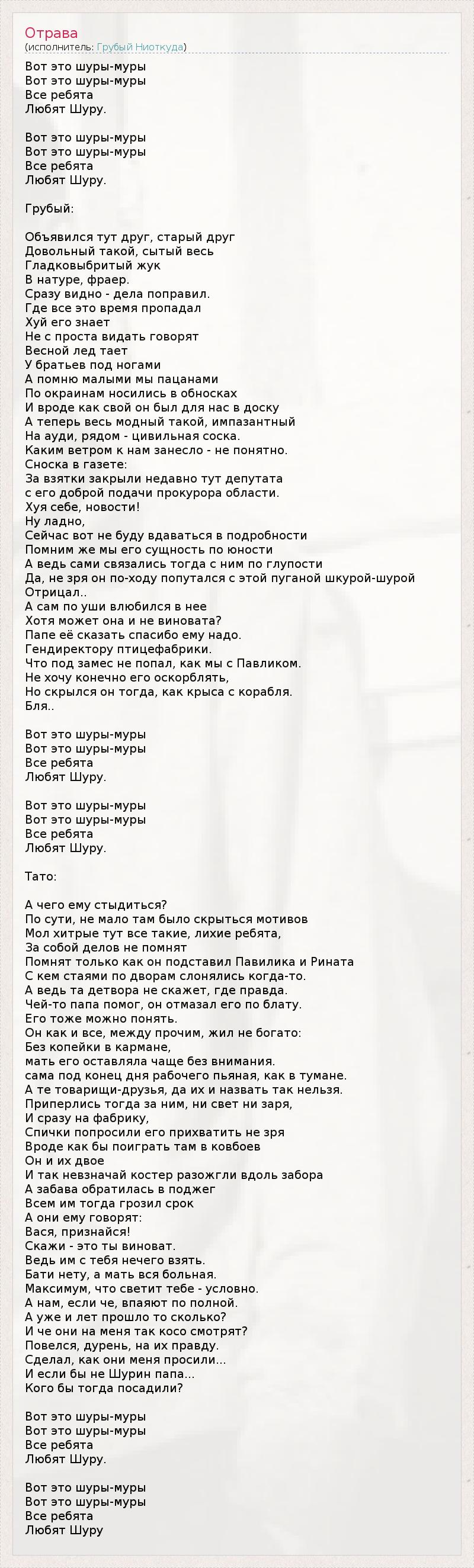 Это интересно:Грубый Ниоткуда - в 1994 году в его руки попала первая кассета с иностранным рэпом. После чего он начал активно интересоваться западным хип-хоп движением. В 2001 году начал пробовать себя в качестве МС. На сегодняшний день является одним из самых ярких представителей Московского Рэпа. Действующий участник объединения 237 Family и "Кризиз Рекордс".237 RECORDS - работает с наиболее смелыми авангардными... продолжение