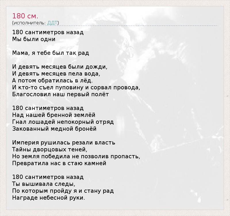 180 сантиметров назад Мы были одни Мама, я тебе был так рад И девять месяцев были дожди, И девять месяцев пела вода, А потом обратилась в лёд. И кто-то съел пуповину и сорвал провода, Благословил наш первый полёт 180 сантиметров назад Над нашей бренной землёй Гнал лошадей непокорный отряд Закованный медной бронёй Империя рушилась резали власть Тайны дворцовых теней, Но земля победила не позволив пропасть, Превратила нас в стаю камней 180 сантиметров назад Ты вышивала следы, По которым пройду я и стану рад Награде небесной руки.
