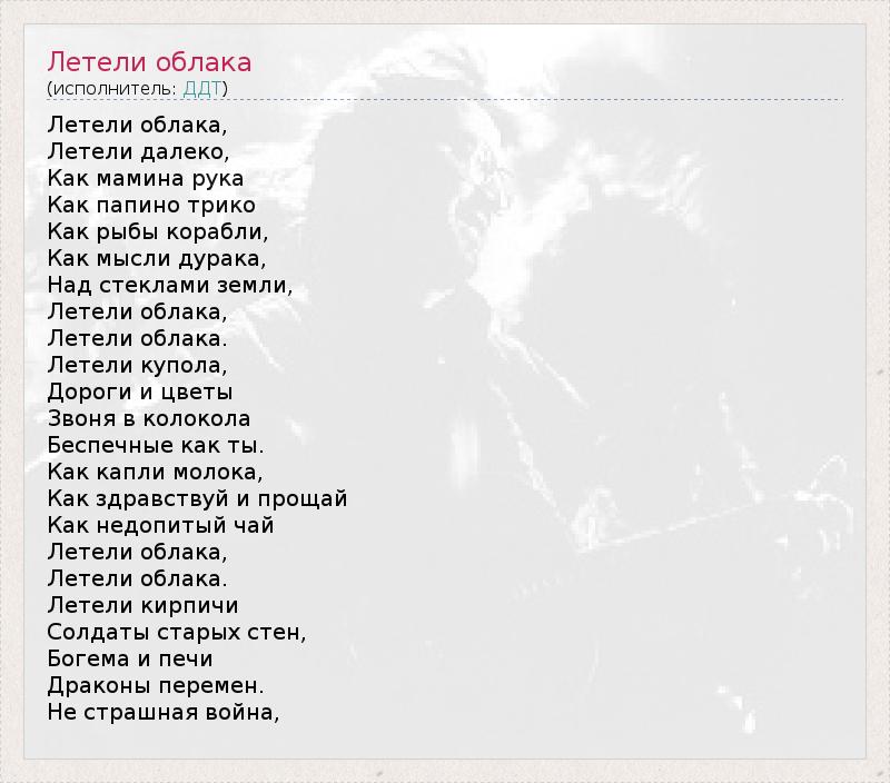 Это интересно:«ДДТ» («DDT») — российская рок-группа, основанная в 1980 году в Уфе. Лидер группы, автор большинства песен и единственный бессменный участник — поэт, композитор, исполнитель, художник, актёр и продюсер Юрий Шевчук.Название группы происходит от химического вещества ДДТ = Ди-хлор-Ди-фенил-Три-хлор-метил-метан, которое использовалось при борьбе с насекомыми-паразитами, запрещенное в большинстве... продолжение