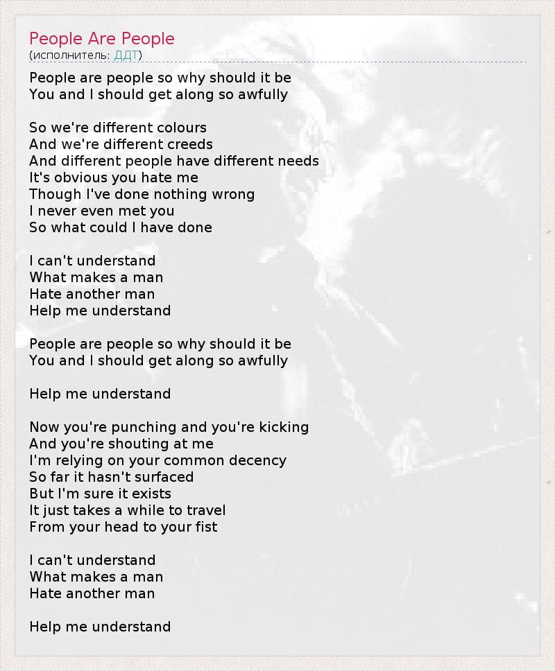 Люди есть люди Люди есть люди. Но как же может быть так, Что мы с тобой так ужасно ладим друг с другом? Мы разных цветов, И у нас разное вероисповедание. И у разных людей разные нужды. Очевидно, что ты ненавидишь меня, Хотя я не сделал ничего плохого. Мы с тобой даже не встречались. Так что же я мог сделать? Я не могу понять, Что заставляет человека Ненавидеть другого человека. Помоги мне понять. Помоги мне понять. Сейчас ты стучишь кулаками, И пинаешься, И кричишь на меня. Я рассчитываю на твое благоразумие. Хотя пока оно никак не проявлялось, Я уверен, что оно есть. Просто ему нужно немного времени, Чтобы добраться от твоей головы до твоих кулаков. Перевод: Vlad.i.miR