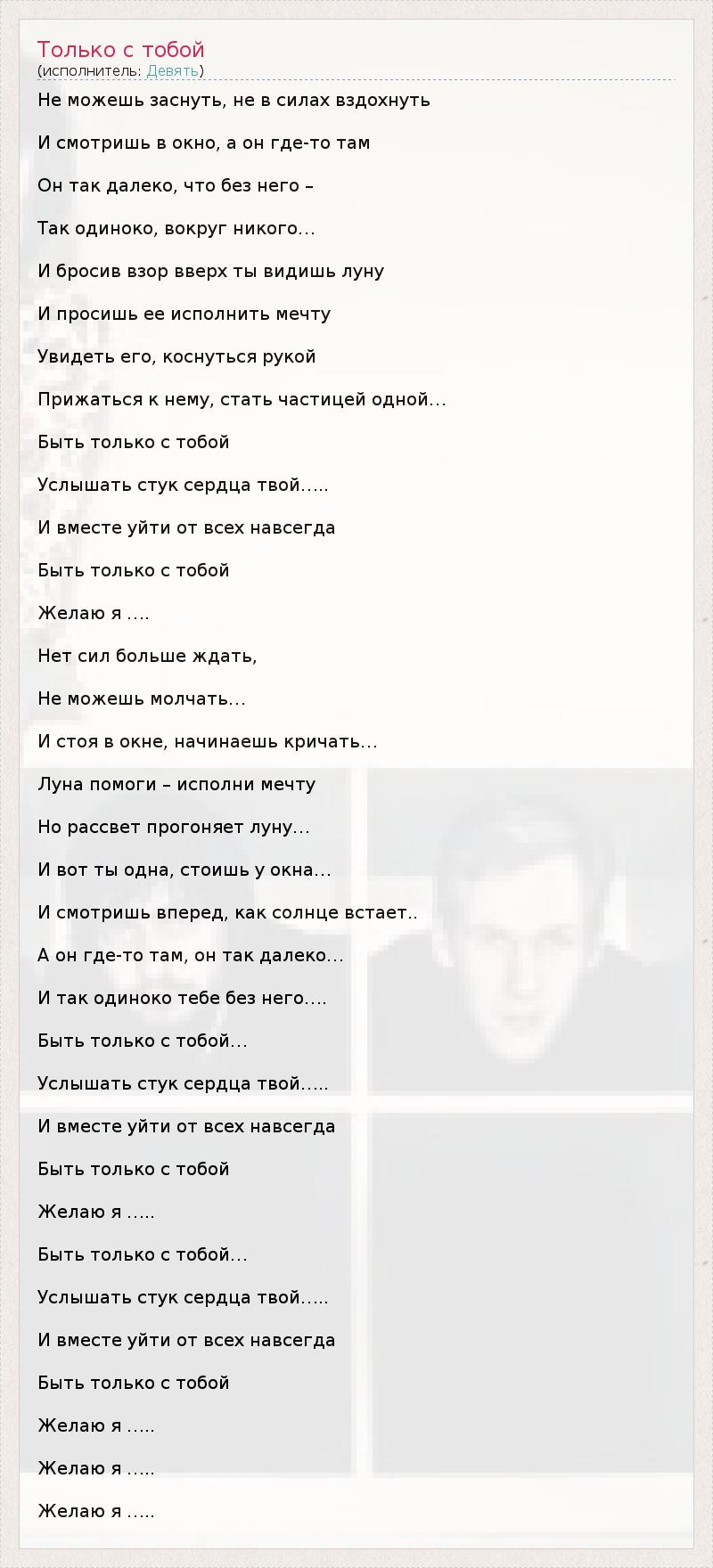 Не можешь заснуть, не в силах вздохнуть И смотришь в окно, а он где-то там Он так далеко, что без него – Так одиноко, вокруг никого… И бросив взор вверх ты видишь луну И просишь ее исполнить мечту Увидеть его, коснуться рукой Прижаться к нему, стать частицей одной… Быть только с тобой Услышать стук сердца твой….. И вместе уйти от всех навсегда Быть только с тобой Желаю я …. Нет сил больше ждать, Не можешь молчать… И стоя в окне, начинаешь кричать… Луна помоги – исполни мечту Но рассвет прогоняет луну… И вот ты одна, стоишь у окна… И смотришь вперед, как солнце встает.. А он где-то там, он так далеко… И так одиноко тебе без него…. Быть только с тобой… Услышать стук сердца твой….. И вместе уйти от всех навсегда Быть только с тобой Желаю я ….. Быть только с тобой… Услышать стук сердца твой….. И вместе уйти от всех навсегда Быть только с тобой Желаю я ….. Желаю я ….. Желаю я …..