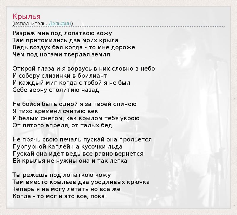 Разреж мне под лопаткою кожу Там притомились два моих крыла Ведь воздух бал когда - то мне дороже Чем под ногами твердая земля Открой глаза и я ворвусь в них словно в небо И соберу слизинки в брилиант И каждый миг когда с тобой я не был Себе верну столитию назад Не бойся быть одной я за твоей спиною Я тихо времени считаю век И белым снегом, как крылом тебя укрою От пятого апреля, от талых бед Не прячь свою печаль пускай она прольется Пурпурной каплей на кусочки льда Пускай она идет ведь все равно вернется Ей крылья не нужны она и так легка Ты режешь под лопаткою кожу Там вместо крыльев два уродливых крючка Теперь я не могу летать но все же Когда - то мог и это все, пока!