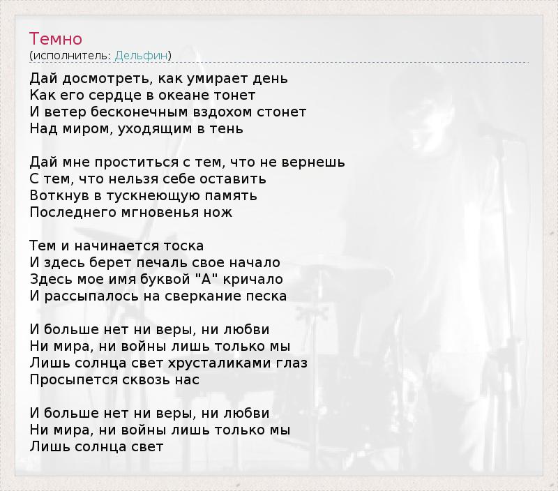 Дай досмотреть, как умирает день Как его сердце в океане тонет И ветер бесконечным вздохом стонет Над миром, уходящим в тень Дай мне проститься с тем, что не вернешь С тем, что нельзя себе оставить Воткнув в тускнеющую память Последнего мгновенья нож Тем и начинается тоска И здесь берет печаль свое начало Здесь мое имя буквой "А" кричало И рассыпалось на сверкание песка И больше нет ни веры, ни любви Ни мира, ни войны лишь только мы Лишь солнца свет хрусталиками глаз Просыпется сквозь нас И больше нет ни веры, ни любви Ни мира, ни войны лишь только мы Лишь солнца свет