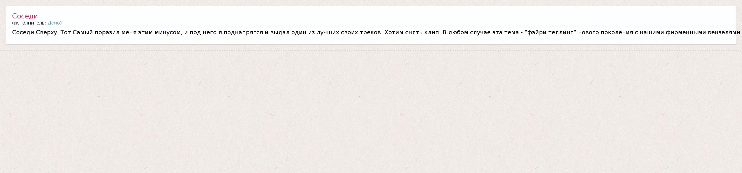 Соседи Сверху. Тот Самый поразил меня этим минусом, и под него я поднапрягся и выдал один из лучших своих треков. Хотим снять клип. В любом случае эта тема - "фэйри теллинг" нового поколения с нашими фирменными вензелями.