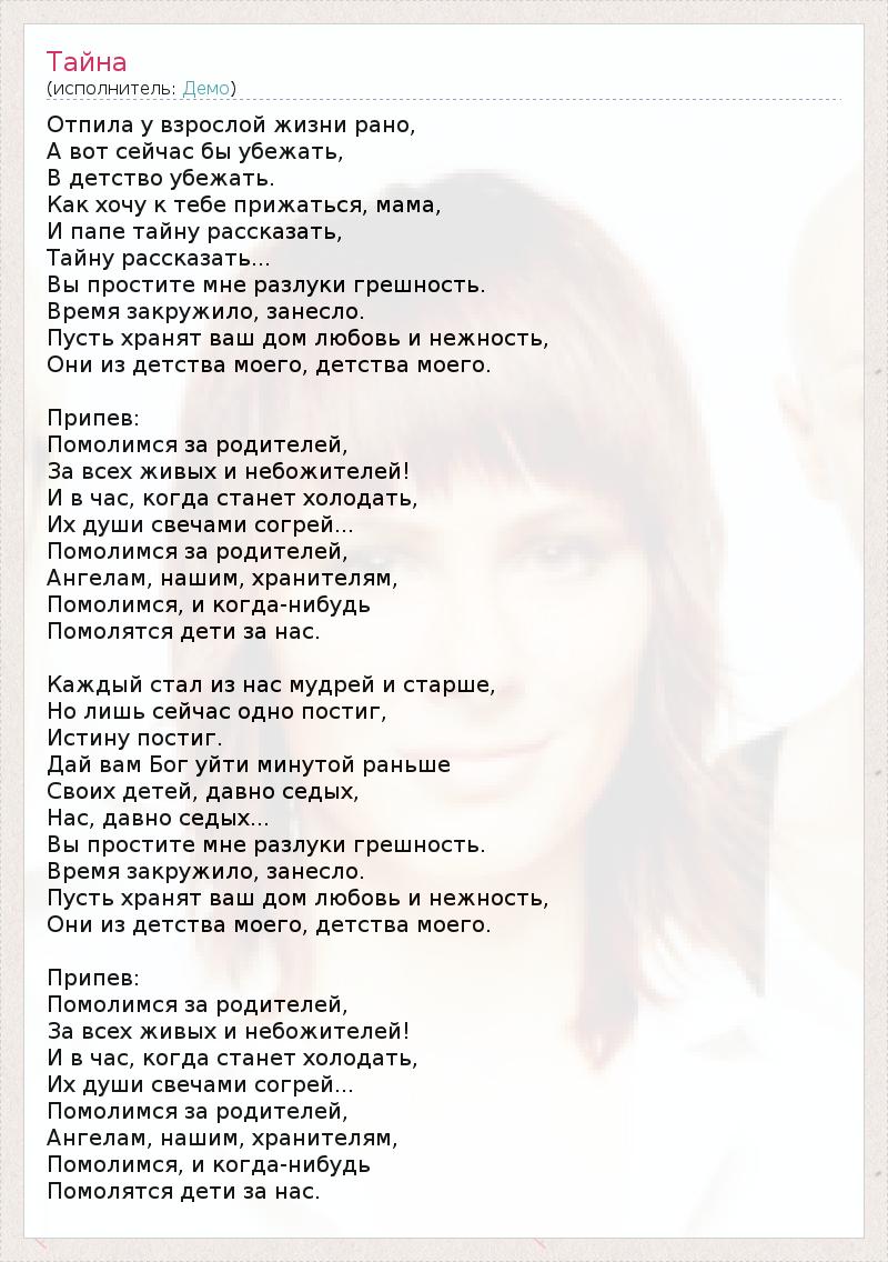 Отпила у взрослой жизни рано, А вот сейчас бы убежать, В детство убежать. Как хочу к тебе прижаться, мама, И папе тайну рассказать, Тайну рассказать... Вы простите мне разлуки грешность. Время закружило, занесло. Пусть хранят ваш дом любовь и нежность, Они из детства моего, детства моего. Припев: Помолимся за родителей, За всех живых и небожителей! И в час, когда станет холодать, Их души свечами согрей... Помолимся за родителей, Ангелам, нашим, хранителям, Помолимся, и когда-нибудь Помолятся дети за нас. Каждый стал из нас мудрей и старше, Но лишь сейчас одно постиг, Истину постиг. Дай вам Бог уйти минутой раньше Своих детей, давно седых, Нас, давно седых... Вы простите мне разлуки грешность. Время закружило, занесло. Пусть хранят ваш дом любовь и нежность, Они из детства моего, детства моего. Припев: Помолимся за родителей, За всех живых и небожителей! И в час, когда станет холодать, Их души свечами согрей... Помолимся за родителей, Ангелам, нашим, хранителям, Помолимся, и когда-нибудь Помолятся дети за нас.