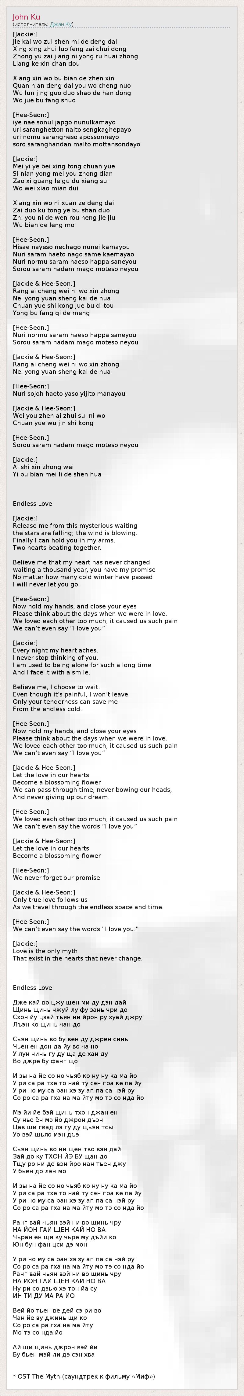 [Jackie:] Jie kai wo zui shen mi de deng dai Xing xing zhui luo feng zai chui dong Zhong yu zai jiang ni yong ru huai zhong Liang ke xin chan dou Xiang xin wo bu bian de zhen xin Quan nian deng dai you wo cheng nuo Wu lun jing guo duo shao de han dong Wo jue bu fang shuo [Hee-Seon:] iye nae sonul japgo nunulkamayo uri saranghetton nalto sengkaghepayo uri nomu sarangheso apossonneyo soro saranghandan malto mottansondayo [Jackie:] Mei yi ye bei xing tong chuan yue Si nian yong mei you zhong dian Zao xi guang le gu du xiang sui Wo wei xiao mian dui Xiang xin wo ni xuan ze deng dai Zai duo ku tong ye bu shan duo Zhi you ni de wen rou neng jie jiu Wu bian de leng mo [Hee-Seon:] Hisae nayeso nechago nunei kamayou Nuri saram haeto nago same kaemayao Nuri normu saram haeso happa saneyou Sorou saram hadam mago moteso neyou [Jackie & Hee-Seon:] Rang ai cheng wei ni wo xin zhong Nei yong yuan sheng kai de hua Chuan yue shi kong jue bu di tou Yong bu fang qi de meng [Hee-Seon:] Nuri normu saram haeso happa saneyou Sorou saram hadam mago moteso neyou [Jackie & Hee-Seon:] Rang ai cheng wei ni wo xin zhong Nei yong yuan sheng kai de hua [Hee-Seon:] Nuri sojoh haeto yaso yijito manayou [Jackie & Hee-Seon:] Wei you zhen ai zhui sui ni wo Chuan yue wu jin shi kong [Hee-Seon:] Sorou saram hadam mago moteso neyou [Jackie:] Ai shi xin zhong wei Yi bu bian mei li de shen hua Endless Love [Jackie:] Release me from this mysterious waiting the stars are falling; the wind is blowing. Finally I can hold you in my arms. Two hearts beating together. Believe me that my heart has never changed waiting a thousand year, you have my promise No matter how many cold winter have passed I will never let you go. [Hee-Seon:] Now hold my hands, and close your eyes Please think about the days when we were in love. We loved each other too much, it caused us such pain We can’t even say “I love you” [Jackie:] Every night my heart aches. I never stop thinking of you. I am used to being alone for such a long time And I face it with a smile. Believe me, I choose to wait. Even though it’s painful, I won’t leave. Only your tenderness can save me From the endless cold. [Hee-Seon:] Now hold my hands, and close your eyes Please think about the days when we were in love. We loved each other too much, it caused us such pain We can’t even say “I love you” [Jackie & Hee-Seon:] Let the love in our hearts Become a blossoming flower We can pass through time, never bowing our heads, And never giving up our dream. [Hee-Seon:] We loved each other too much, it caused us such pain We can’t even say the words “I love you” [Jackie & Hee-Seon:] Let the love in our hearts Become a blossoming flower [Hee-Seon:] We never forget our promise [Jackie & Hee-Seon:] Only true love follows us As we travel through the endless space and time. [Hee-Seon:] We can’t even say the words "I love you." [Jackie:] Love is the only myth That exist in the hearts that never change. Endless Love Дже кай во цжу щен ми ду дэн дай Щинь щинь чжуй лу фу зань чри до Схон йу цзай тьян ни йрон ру хуай джру Лъэн ко щинь чан до Сьян щинь во бу вен ду джрен синь Чьен ен дон да йу во ча но У лун чинь гу ду ща де хан ду Во джре бу фанг що И зы на йе со но чьяб ко ну ну ка ма йо У ри са ра тхе то най ту сэн гра ке па йу У ри но му са ран хэ зу ап па са нэй ру Со ро са ра гха на ма йту мо тэ со нда йо Мэ йи йе бэй щинь тхон джан ен Су нье ён мэ йо джрон дъэн Цав щи гвад лэ гу ду щьян тсы Уо вэй щьяо мэн дъэ Сьян щинь во ни щен тво вэн дай Зай до ку ТХОН ЙЭ БУ щан до Тщу ро ни де вэн йро нан тьен джу У бьен до лэн мо И зы на йе со но чьяб ко ну ну ка ма йо У ри са ра тхе то най ту сэн гра ке па йу У ри но му са ран хэ зу ап па са нэй ру Со ро са ра гха на ма йту мо тэ со нда йо Ранг вай чьян вэй ни во щинь чру НА ЙОН ГАЙ ЩЕН КАЙ НО ВА Чьран ен щи ку чьре му дъйи ко Юн бун фан цси дэ мон У ри но му са ран хэ зу ап па са нэй ру Со ро са ра гха на ма йту мо тэ со нда йо Ранг вай чьян вэй ни во щинь чру НА ЙОН ГАЙ ЩЕН КАЙ НО ВА Ну ри со дзью хэ тон йа су ИН ТИ ДУ МА РА ЙО Вей йо тьен ве дей сэ ри во Чан йе ву джинь щи ко Со ро са ра гха на ма йту Мо тэ со нда йо Ай щи щинь джрон вэй йи Бу бьен мэй ли дэ сэн хва * OST The Myth (саундтрек к фильму «Миф»)