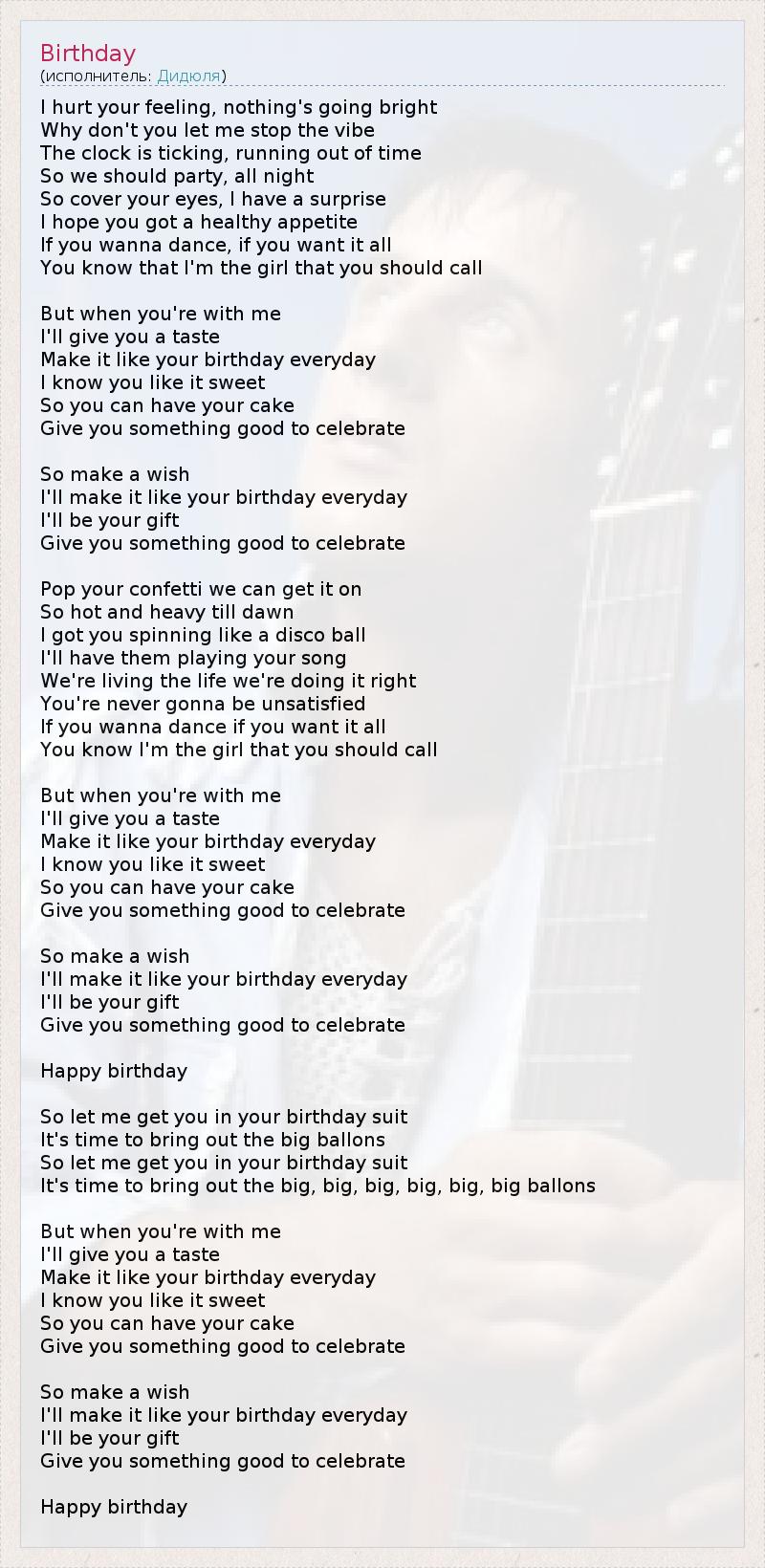 Я задела твои чувства, всё стало слишком плохо, Так почему ты не остановишь меня? Часы тикают, время уходит, Давай же будем отрываться ночь напролёт. Закрой глаза, у меня для тебя сюрприз, Надеюсь, ты голоден? Если хочешь потанцевать и оторваться, То знай: я – та, кому тебе следует позвонить. Ведь когда ты со мной, Я дам тебе попробовать, Я превращу каждый твой день в день рождения Я знаю, ты любишь сладости, Угощайся тортом, Я найду для тебя повод отпраздновать. Загадай желание, Я превращу каждый день в день рождения, Я буду твоим подарком, Я найду тебе повод отпраздновать. Взрывай хлопушки, давай расслабимся, Ведь здесь так жарко и душно до самого рассвета Я вскружу тебя голову, словно диско-шар, И попрошу, чтобы включили твою любимую песню. Мы наслаждаемся жизнью, мы всё делаем правильно, Ты останешься доволен, Если хочешь потанцевать и оторваться, То знай, я – та, кому тебе следует позвонить. Ведь когда ты со мной, Я дам тебе попробовать, Я превращу каждый твой день в день рождения Знаю, ты любишь сладости, Угощайся тортом, Я найду для тебя повод отпраздновать. Загадай желание, Я превращу каждый день в день рождения, Я буду твоим подарком, Я найду тебе повод отпраздновать. С днём рождения! Разреши мне одеть тебя в то, в чём ты появился на свет, Самое время отпустить воздушные шары, Разреши мне одеть тебя в то, в чём ты появился на свет, Самое время отпустить воздушные шары. Ведь когда ты со мной, Я дам тебе попробовать, Я превращу каждый твой день в день рождения Знаю, ты любишь сладости, Угощайся тортом, Я найду для тебя повод отпраздновать. Загадай желание, Я превращу каждый день в день рождения, Я буду твоим подарком, Я найду для тебя повод отпраздновать. С днём рождения!