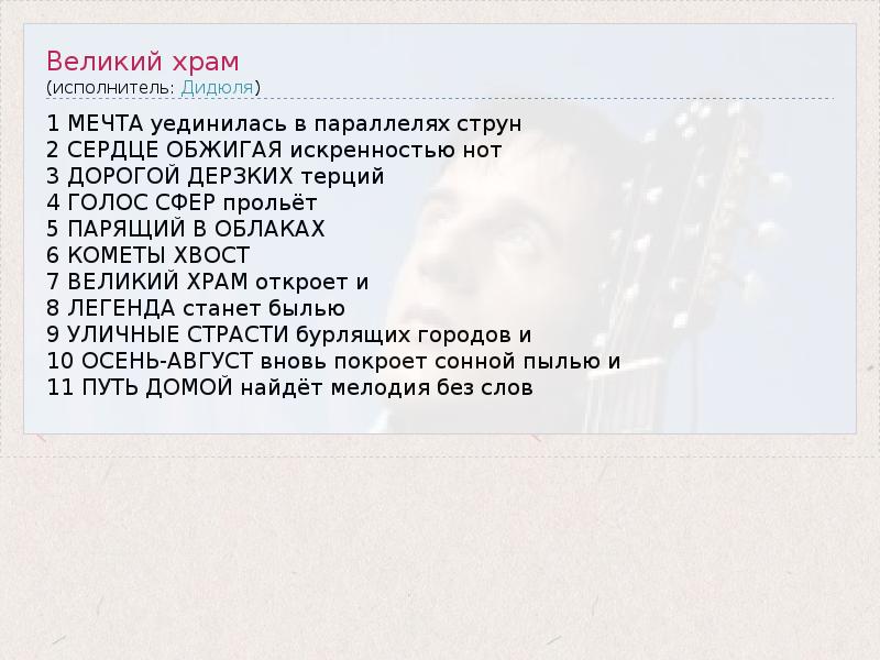 Это интересно:ДиДюЛя – гитарист-виртуоз, композитор и лидер одноименной инструментальной группы, который играет музыку в стилевом диапазоне от нео-фламенко до рока и фолка. ДиДюЛя является самым известным инструменталистом в России.Осенью 2012 года готовится релиз нового номерного CD ДиДюЛи под рабочим названием «Орнаментальный». Также заканчивается работа над новым альбомом «LIVE in Kremlin» в подарочном... продолжение