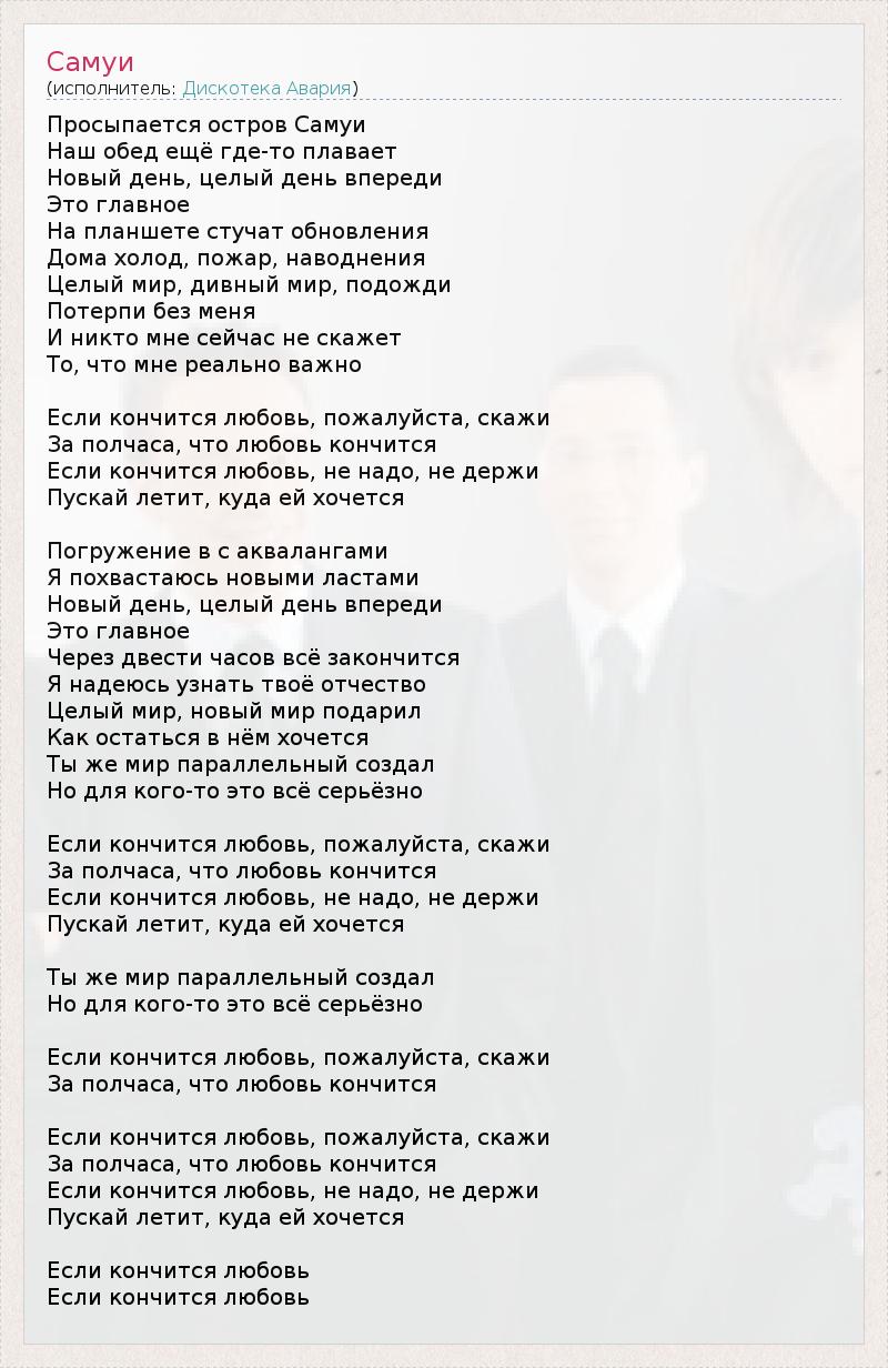 Просыпается остров Самуи Наш обед ещё где-то плавает Новый день, целый день впереди Это главное На планшете стучат обновления Дома холод, пожар, наводнения Целый мир, дивный мир, подожди Потерпи без меня И никто мне сейчас не скажет То, что мне реально важно Если кончится любовь, пожалуйста, скажи За полчаса, что любовь кончится Если кончится любовь, не надо, не держи Пускай летит, куда ей хочется Погружение в с аквалангами Я похвастаюсь новыми ластами Новый день, целый день впереди Это главное Через двести часов всё закончится Я надеюсь узнать твоё отчество Целый мир, новый мир подарил Как остаться в нём хочется Ты же мир параллельный создал Но для кого-то это всё серьёзно Если кончится любовь, пожалуйста, скажи За полчаса, что любовь кончится Если кончится любовь, не надо, не держи Пускай летит, куда ей хочется Ты же мир параллельный создал Но для кого-то это всё серьёзно Если кончится любовь, пожалуйста, скажи За полчаса, что любовь кончится Если кончится любовь, пожалуйста, скажи За полчаса, что любовь кончится Если кончится любовь, не надо, не держи Пускай летит, куда ей хочется Если кончится любовь Если кончится любовь