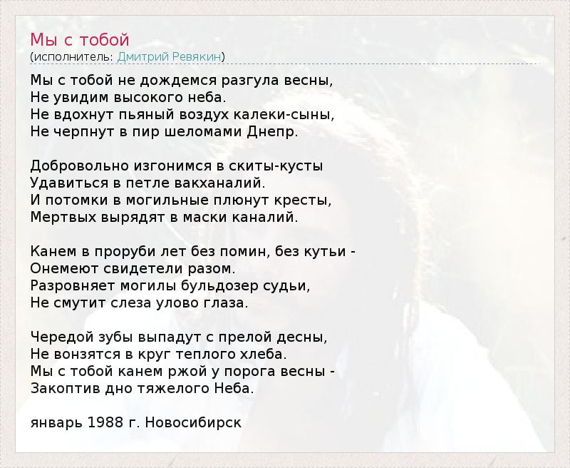 Это интересно:Дмитрий Александрович Ревякин - Поэт, автор стихов и музыки, основатель и лидер группы "Калинов Мост". С 2005г. член Союза писателей России, автор книг стихов "Гнев Cовы" и "Кольца Алые".Родился в Новосибирске 13 февраля 1964 года, рос в Забайкалье, в поселке Первомайский Читинской области. Учился в музыкальной школе по классу баяна. Окончил Радиотехнический факультет Новосибирского... продолжение