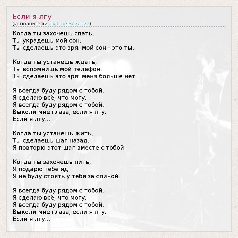 Когда ты захочешь спать, Ты украдешь мой сон. Ты сделаешь это зря: мой сон - это ты. Когда ты устанешь ждать, Ты вспомнишь мой телефон. Ты сделаешь это зря: меня больше нет. Я всегда буду рядом с тобой. Я сделаю всё, что могу. Я всегда буду рядом с тобой. Выколи мне глаза, если я лгу. Если я лгу... Когда ты устанешь жить, Ты сделаешь шаг назад. Я повторю этот шаг вместе с тобой. Когда ты захочешь пить, Я подарю тебе яд. Я не буду стоять у тебя за спиной. Я всегда буду рядом с тобой. Я сделаю всё, что могу. Я всегда буду рядом с тобой. Выколи мне глаза, если я лгу. Если я лгу...