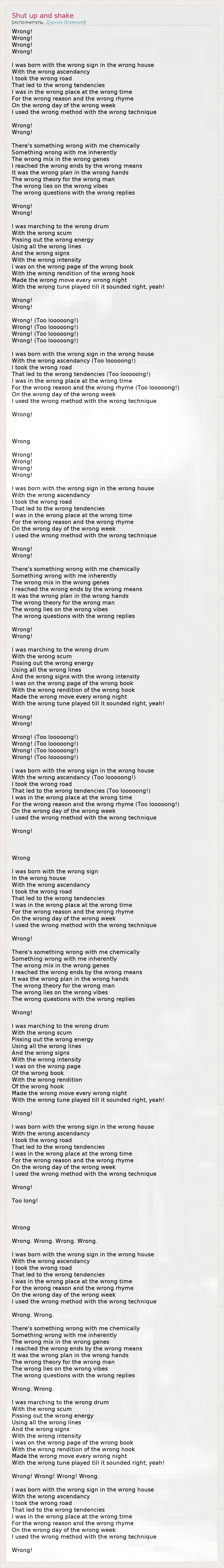 Wrong! Wrong! Wrong! Wrong! I was born with the wrong sign in the wrong house With the wrong ascendancy I took the wrong road That led to the wrong tendencies I was in the wrong place at the wrong time For the wrong reason and the wrong rhyme On the wrong day of the wrong week I used the wrong method with the wrong technique Wrong! Wrong! There's something wrong with me chemically Something wrong with me inherently The wrong mix in the wrong genes I reached the wrong ends by the wrong means It was the wrong plan in the wrong hands The wrong theory for the wrong man The wrong lies on the wrong vibes The wrong questions with the wrong replies Wrong! Wrong! I was marching to the wrong drum With the wrong scum Pissing out the wrong energy Using all the wrong lines And the wrong signs With the wrong intensity I was on the wrong page of the wrong book With the wrong rendition of the wrong hook Made the wrong move every wrong night With the wrong tune played till it sounded right, yeah! Wrong! Wrong! Wrong! (Too looooong!) Wrong! (Too looooong!) Wrong! (Too looooong!) Wrong! (Too looooong!) I was born with the wrong sign in the wrong house With the wrong ascendancy (Too looooong!) I took the wrong road That led to the wrong tendencies (Too looooong!) I was in the wrong place at the wrong time For the wrong reason and the wrong rhyme (Too looooong!) On the wrong day of the wrong week I used the wrong method with the wrong technique Wrong! Wrong Wrong! Wrong! Wrong! Wrong! I was born with the wrong sign in the wrong house With the wrong ascendancy I took the wrong road That led to the wrong tendencies I was in the wrong place at the wrong time For the wrong reason and the wrong rhyme On the wrong day of the wrong week I used the wrong method with the wrong technique Wrong! Wrong! There's something wrong with me chemically Something wrong with me inherently The wrong mix in the wrong genes I reached the wrong ends by the wrong means It was the wrong plan in the wrong hands The wrong theory for the wrong man The wrong lies on the wrong vibes The wrong questions with the wrong replies Wrong! Wrong! I was marching to the wrong drum With the wrong scum Pissing out the wrong energy Using all the wrong lines And the wrong signs with the wrong intensity I was on the wrong page of the wrong book With the wrong rendition of the wrong hook Made the wrong move every wrong night With the wrong tune played till it sounded right, yeah! Wrong! Wrong! Wrong! (Too looooong!) Wrong! (Too looooong!) Wrong! (Too looooong!) Wrong! (Too looooong!) I was born with the wrong sign in the wrong house With the wrong ascendancy (Too looooong!) I took the wrong road That led to the wrong tendencies (Too looooong!) I was in the wrong place at the wrong time For the wrong reason and the wrong rhyme (Too looooong!) On the wrong day of the wrong week I used the wrong method with the wrong technique Wrong! Wrong I was born with the wrong sign In the wrong house With the wrong ascendancy I took the wrong road That led to the wrong tendencies I was in the wrong place at the wrong time For the wrong reason and the wrong rhyme On the wrong day of the wrong week I used the wrong method with the wrong technique Wrong! There's something wrong with me chemically Something wrong with me inherently The wrong mix in the wrong genes I reached the wrong ends by the wrong means It was the wrong plan in the wrong hands The wrong theory for the wrong man The wrong lies on the wrong vibes The wrong questions with the wrong replies Wrong! I was marching to the wrong drum With the wrong scum Pissing out the wrong energy Using all the wrong lines And the wrong signs With the wrong intensity I was on the wrong page Of the wrong book With the wrong rendition Of the wrong hook Made the wrong move every wrong night With the wrong tune played till it sounded right, yeah! Wrong! I was born with the wrong sign in the wrong house With the wrong ascendancy I took the wrong road That led to the wrong tendencies I was in the wrong place at the wrong time For the wrong reason and the wrong rhyme On the wrong day of the wrong week I used the wrong method with the wrong technique Wrong! Too long! Wrong Wrong. Wrong. Wrong. Wrong. I was born with the wrong sign in the wrong house With the wrong ascendancy I took the wrong road That led to the wrong tendencies I was in the wrong place at the wrong time For the wrong reason and the wrong rhyme On the wrong day of the wrong week I used the wrong method with the wrong technique Wrong. Wrong. There's something wrong with me chemically Something wrong with me inherently The wrong mix in the wrong genes I reached the wrong ends by the wrong means It was the wrong plan in the wrong hands The wrong theory for the wrong man The wrong lies on the wrong vibes The wrong questions with the wrong replies Wrong. Wrong. I was marching to the wrong drum With the wrong scum Pissing out the wrong energy Using all the wrong lines And the wrong signs With the wrong intensity I was on the wrong page of the wrong book With the wrong rendition of the wrong hook Made the wrong move every wrong night With the wrong tune played till it sounded right, yeah! Wrong! Wrong! Wrong! Wrong. I was born with the wrong sign in the wrong house With the wrong ascendancy I took the wrong road That led to the wrong tendencies I was in the wrong place at the wrong time For the wrong reason and the wrong rhyme On the wrong day of the wrong week I used the wrong method with the wrong technique Wrong!