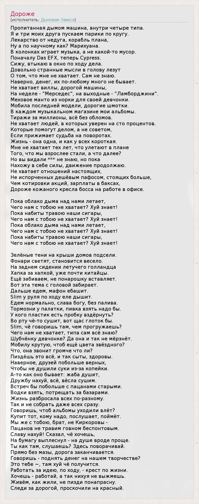 Пропитанная дымом машина, внутри четыре типа. Я и три моих друга пускаем парики по кругу. Лекарство от недуга, корабль плана, Ну а по научному как? Марихуана. В колонках играет музыка, а не какой-то мусор. Поначалу Das EFX, теперь Cypress. Сижу, втыкаю в окно по ходу дела. Довольно странные мысли в голову лезут О том, что мне не хватает. Сам не знаю. Наверно, денег, их по-любому много не бывает. Не хватает виллы, дорогой машины, На неделе - "Мерседес", на выходные - "Ламборджини". Меховое манто из норки для своей девчонки. Мобила последней модели, дорогие шмотки. В каждом музыкальном магазине мои альбомы. Тиражи за миллионы, всё без обломов. Не хватает людей, в которых уверен на сто процентов. Которые помогут делом, а не советом, Если прижимает судьба на поворотах. Жизнь - она одна, и как у всех короткая. Мне не хватает тех лет, что улетают в плане Того, что мы взрослее стали, а что далее? Но вы видали *** не знаю, но пока Нахожу в себе силы, движение продолжаю. Не хватает отношений настоящих, Не испорченных дешёвым пафосом, стоящих больше, Чем котировки акций, зарплаты в баксах, Дороже кожаного кресла босса на работе в офисе. Пока облако дыма над нами летает, Чего нам с тобою не хватает? Хуй знает! Пока набиты травою наши сигары, Чего нам с тобою не хватает? Хуй знает! Пока облако дыма над нами летает, Чего нам с тобою не хватает? Хуй знает! Пока набиты травою наши сигары, Чего нам с тобою не хватает? Хуй знает! Зелёные тени на крыши домов подсели. Фонари светят, становится весело. На заднем сидении летучего голландца Хапка за хапкой, уже почти китайцы. Ещё забиваем, не понарошку вставляет. Вот эта тема с головой забирает. Дальше едем, мафон ебашит. Slim у руля по ходу еле дышит. Едем нормально, слава богу, без палива. Тормозни у палатки, пивка взять надо бы. У кого пластик есть пробку вздёрнуть? Во рту чё-то сушит, вот щас глоток бы. Slim, чё говоришь там, чем прогружаешь? Чего нам не хватает, типа сам всё знаю? Шубчёнку девчонке? Да она и так не мёрзнёт. Мобилу крутую, чтоб ещё цвета звёздного? Что, она звонит громче что ли? Пиздёшь это всё, и так сыты, здоровы. Наверное, друзей побольше верных, Чтобы не душили суки из-за копейки. А-то как оно бывает: жаба душит, Дружбу нахуй, всё, вёсла сушим. Встреч бы побольше с пацанами старыми. Водки взять, потрещать за базарами. Жизнь разбросала всех по-разному. Так и не собрать даже всех сразу. Говоришь, чтоб альбомы уходили влёт? Купит тот, кому надо, послушает, поймёт. Мы же с тобою, брат, не Киркоровы - Пацанов не травим говном беспонтовым. Славу нахуй! Сказал, чё хочешь, На бумагу выплеснул - на душе вроде проще. Ты как там, слушаешь? Здесь поворачивай. Прямо без мазы, дорога заканчивается. Говоришь - поднять денег на нашем творчестве? Это тебе ~, там хуй чё получится. Работать за идею, по ходу, - крест по жизни. Хочешь - работай, а так нихуя не выжмешь. Живём, как жили, не пизди понапрасну. Следи за дорогой, проскочили на красный.