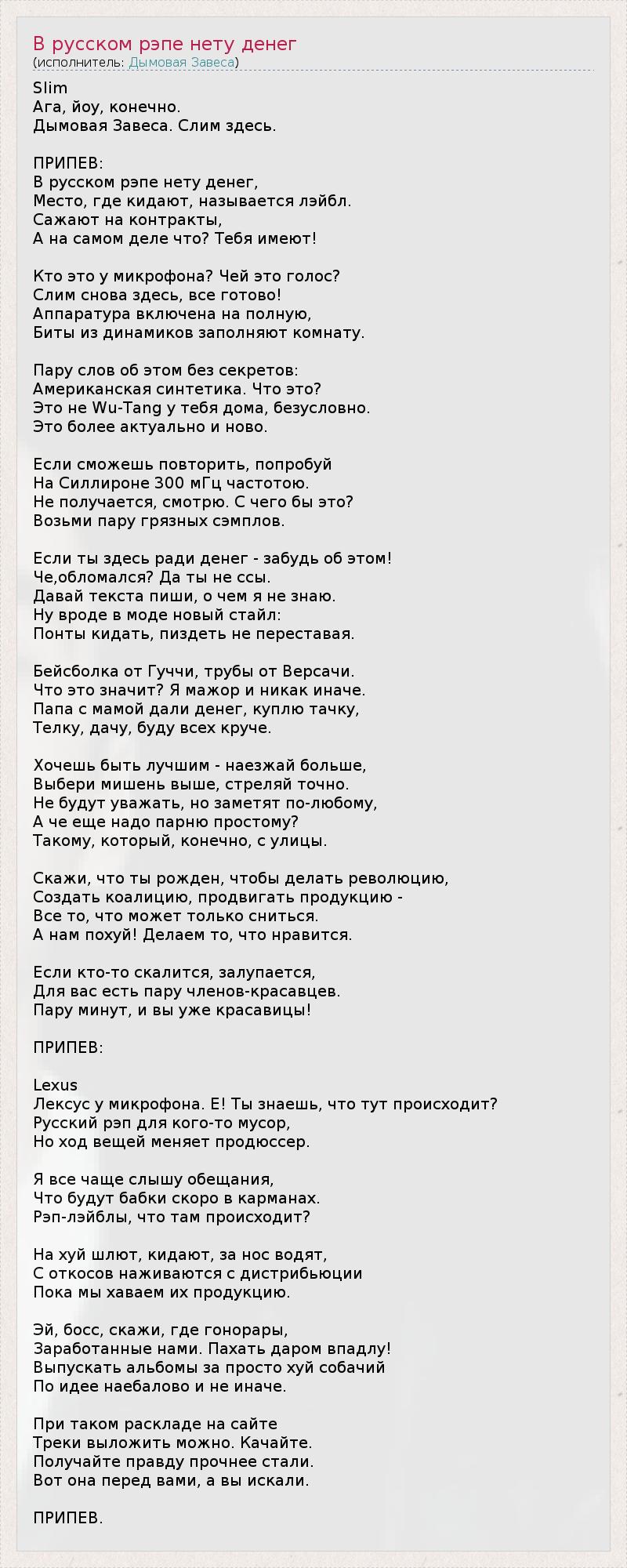 А как ты думаешь, о чем песня "В русском рэпе нету денег" ?