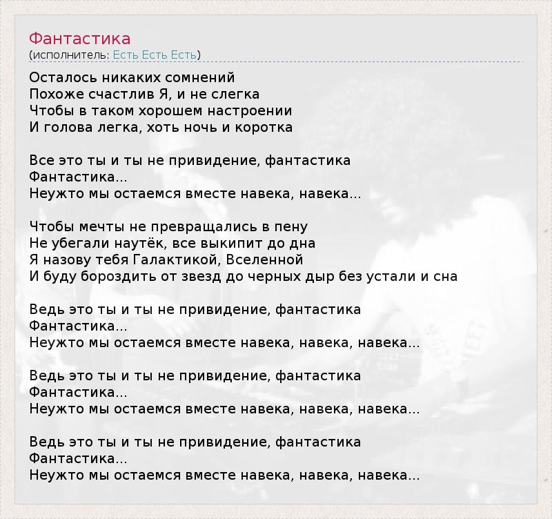 Это интересно:Есть Есть Есть — музыкальная группа в жанре хип-хопа из Санкт-Петербурга, образованная в 2010 году в следующем составе: Михаил Феничев (автор текстов, вокалист; участник группы 2H Company), Алексей Помигалов (биты, клавишные), Максим Поляков (гитара, труба), Фёдор Погорелов (ритм-гитара). По словам музыкантов, использованный в названии коллектива глагол можно понимать... продолжение