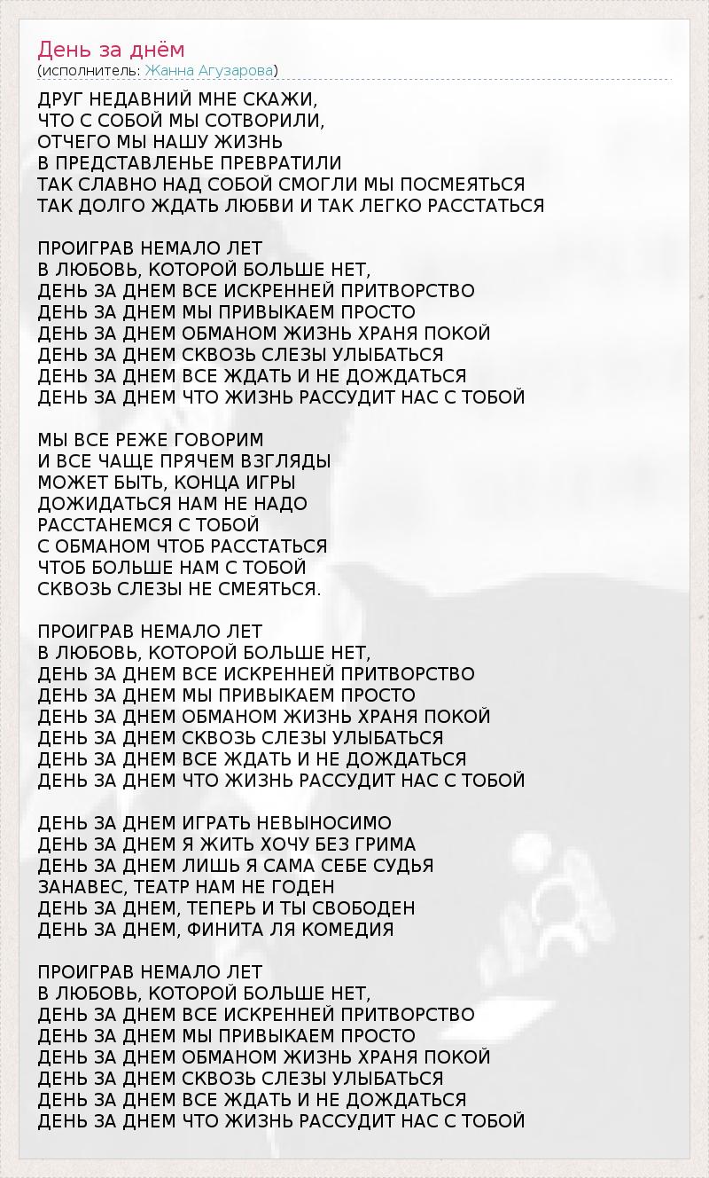 ДРУГ НЕДАВНИЙ МНЕ СКАЖИ, ЧТО С СОБОЙ МЫ СОТВОРИЛИ, ОТЧЕГО МЫ НАШУ ЖИЗНЬ В ПРЕДСТАВЛЕНЬЕ ПРЕВРАТИЛИ ТАК СЛАВНО НАД СОБОЙ СМОГЛИ МЫ ПОСМЕЯТЬСЯ ТАК ДОЛГО ЖДАТЬ ЛЮБВИ И ТАК ЛЕГКО РАССТАТЬСЯ ПРОИГРАВ НЕМАЛО ЛЕТ В ЛЮБОВЬ, КОТОРОЙ БОЛЬШЕ НЕТ, ДЕНЬ ЗА ДНЕМ ВСЕ ИСКРЕННЕЙ ПРИТВОРСТВО ДЕНЬ ЗА ДНЕМ МЫ ПРИВЫКАЕМ ПРОСТО ДЕНЬ ЗА ДНЕМ ОБМАНОМ ЖИЗНЬ ХРАНЯ ПОКОЙ ДЕНЬ ЗА ДНЕМ СКВОЗЬ СЛЕЗЫ УЛЫБАТЬСЯ ДЕНЬ ЗА ДНЕМ ВСЕ ЖДАТЬ И НЕ ДОЖДАТЬСЯ ДЕНЬ ЗА ДНЕМ ЧТО ЖИЗНЬ РАССУДИТ НАС С ТОБОЙ МЫ ВСЕ РЕЖЕ ГОВОРИМ И ВСЕ ЧАЩЕ ПРЯЧЕМ ВЗГЛЯДЫ МОЖЕТ БЫТЬ, КОНЦА ИГРЫ ДОЖИДАТЬСЯ НАМ НЕ НАДО РАССТАНЕМСЯ С ТОБОЙ С ОБМАНОМ ЧТОБ РАССТАТЬСЯ ЧТОБ БОЛЬШЕ НАМ С ТОБОЙ СКВОЗЬ СЛЕЗЫ НЕ СМЕЯТЬСЯ. ПРОИГРАВ НЕМАЛО ЛЕТ В ЛЮБОВЬ, КОТОРОЙ БОЛЬШЕ НЕТ, ДЕНЬ ЗА ДНЕМ ВСЕ ИСКРЕННЕЙ ПРИТВОРСТВО ДЕНЬ ЗА ДНЕМ МЫ ПРИВЫКАЕМ ПРОСТО ДЕНЬ ЗА ДНЕМ ОБМАНОМ ЖИЗНЬ ХРАНЯ ПОКОЙ ДЕНЬ ЗА ДНЕМ СКВОЗЬ СЛЕЗЫ УЛЫБАТЬСЯ ДЕНЬ ЗА ДНЕМ ВСЕ ЖДАТЬ И НЕ ДОЖДАТЬСЯ ДЕНЬ ЗА ДНЕМ ЧТО ЖИЗНЬ РАССУДИТ НАС С ТОБОЙ ДЕНЬ ЗА ДНЕМ ИГРАТЬ НЕВЫНОСИМО ДЕНЬ ЗА ДНЕМ Я ЖИТЬ ХОЧУ БЕЗ ГРИМА ДЕНЬ ЗА ДНЕМ ЛИШЬ Я САМА СЕБЕ СУДЬЯ ЗАНАВЕС, ТЕАТР НАМ НЕ ГОДЕН ДЕНЬ ЗА ДНЕМ, ТЕПЕРЬ И ТЫ СВОБОДЕН ДЕНЬ ЗА ДНЕМ, ФИНИТА ЛЯ КОМЕДИЯ ПРОИГРАВ НЕМАЛО ЛЕТ В ЛЮБОВЬ, КОТОРОЙ БОЛЬШЕ НЕТ, ДЕНЬ ЗА ДНЕМ ВСЕ ИСКРЕННЕЙ ПРИТВОРСТВО ДЕНЬ ЗА ДНЕМ МЫ ПРИВЫКАЕМ ПРОСТО ДЕНЬ ЗА ДНЕМ ОБМАНОМ ЖИЗНЬ ХРАНЯ ПОКОЙ ДЕНЬ ЗА ДНЕМ СКВОЗЬ СЛЕЗЫ УЛЫБАТЬСЯ ДЕНЬ ЗА ДНЕМ ВСЕ ЖДАТЬ И НЕ ДОЖДАТЬСЯ ДЕНЬ ЗА ДНЕМ ЧТО ЖИЗНЬ РАССУДИТ НАС С ТОБОЙ