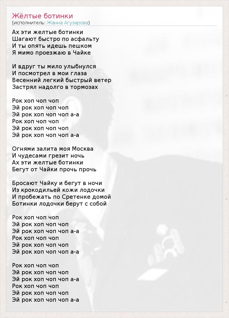 Ах эти желтые ботинки Шагают быстро по асфальту И ты опять идешь пешком Я мимо проезжаю в Чайке И вдруг ты мило улыбнулся И посмотрел в мои глаза Весенний легкий быстрый ветер Застрял надолго в тормозах Рок хоп чоп чоп Эй рок хоп чоп чоп Эй рок хоп чоп чоп а-а Рок хоп чоп чоп Эй рок хоп чоп чоп Эй рок хоп чоп чоп а-а Огнями залита моя Москва И чудесами грезит ночь Ах эти желтые ботинки Бегут от Чайки прочь прочь Бросают Чайку и бегут в ночи Из крокодильей кожи лодочки И пробежать по Сретенке домой Ботинки лодочки берут с собой Рок хоп чоп чоп Эй рок хоп чоп чоп Эй рок хоп чоп чоп а-а Рок хоп чоп чоп Эй рок хоп чоп чоп Эй рок хоп чоп чоп а-а Рок хоп чоп чоп Эй рок хоп чоп чоп Эй рок хоп чоп чоп а-а Рок хоп чоп чоп Эй рок хоп чоп чоп Эй рок хоп чоп чоп а-а