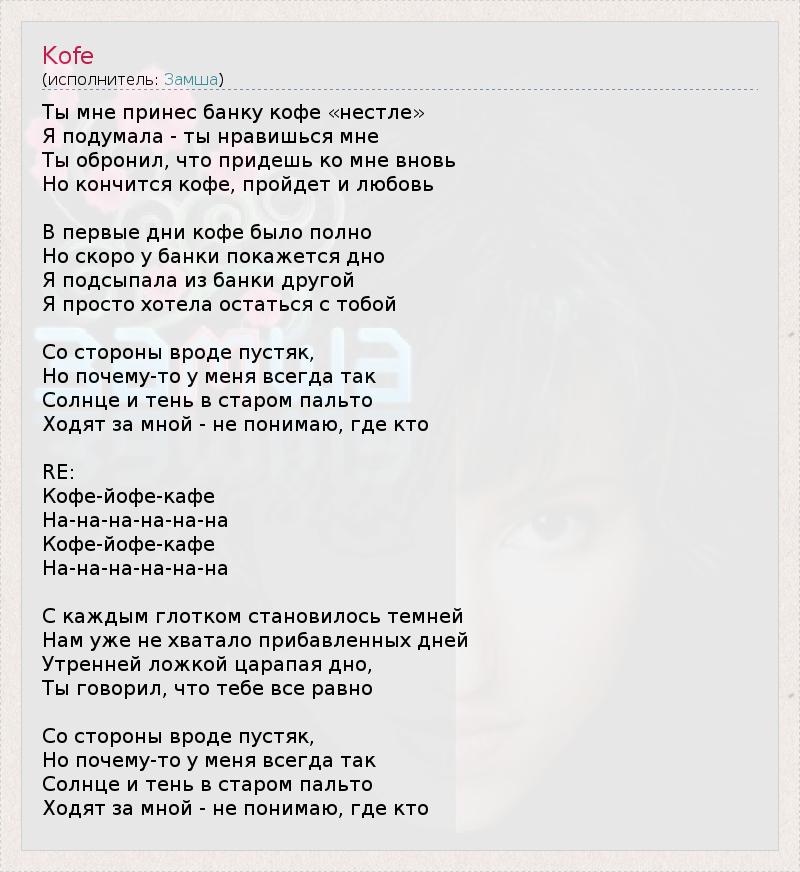 Ты мне принес банку кофе «нестле» Я подумала - ты нравишься мне Ты обронил, что придешь ко мне вновь Но кончится кофе, пройдет и любовь В первые дни кофе было полно Но скоро у банки покажется дно Я подсыпала из банки другой Я просто хотела остаться с тобой Со стороны вроде пустяк, Но почему-то у меня всегда так Солнце и тень в старом пальто Ходят за мной - не понимаю, где кто RE: Кофе-йофе-кафе На-на-на-на-на-на Кофе-йофе-кафе На-на-на-на-на-на С каждым глотком становилось темней Нам уже не хватало прибавленных дней Утренней ложкой царапая дно, Ты говорил, что тебе все равно Со стороны вроде пустяк, Но почему-то у меня всегда так Солнце и тень в старом пальто Ходят за мной - не понимаю, где кто