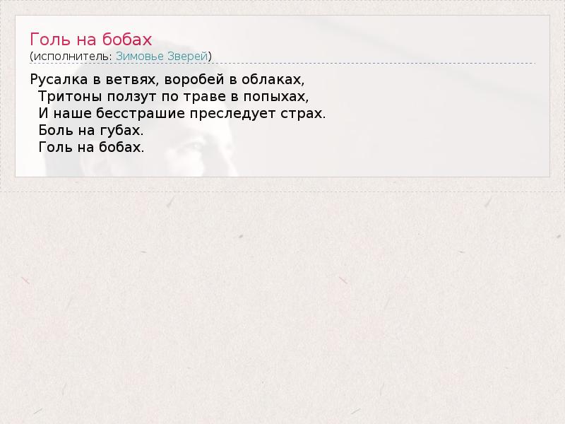 Русалка в ветвях, воробей в облаках, Тритоны ползут по траве в попыхах, И наше бесстрашие преследует страх. Боль на губах. Голь на бобах.