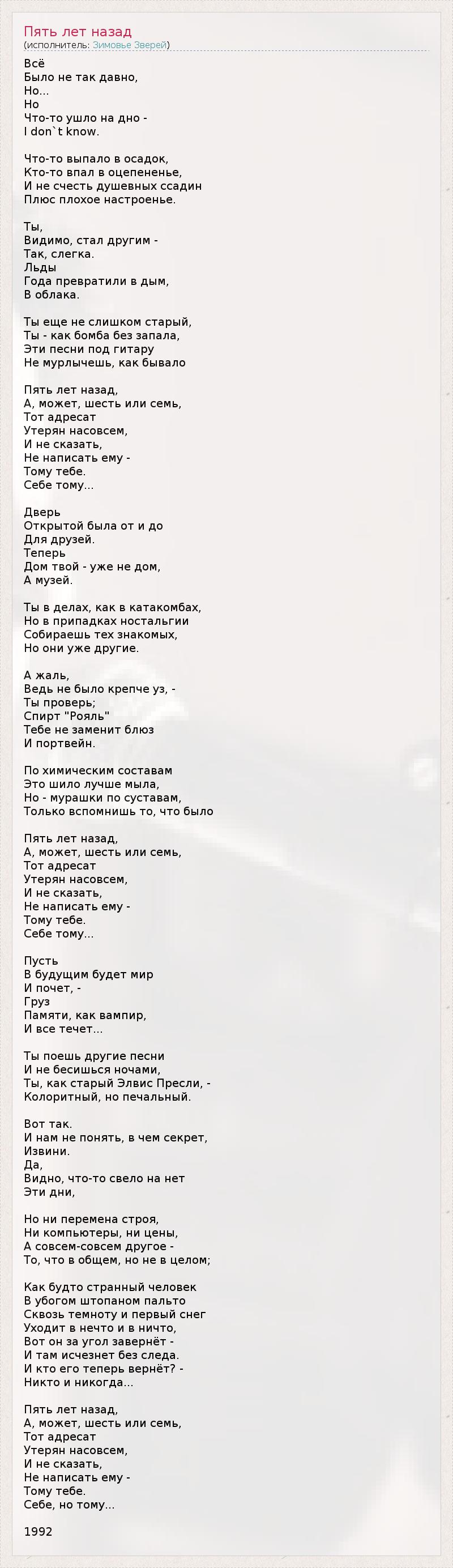 А как ты думаешь, о чем песня "Пять лет назад" ?