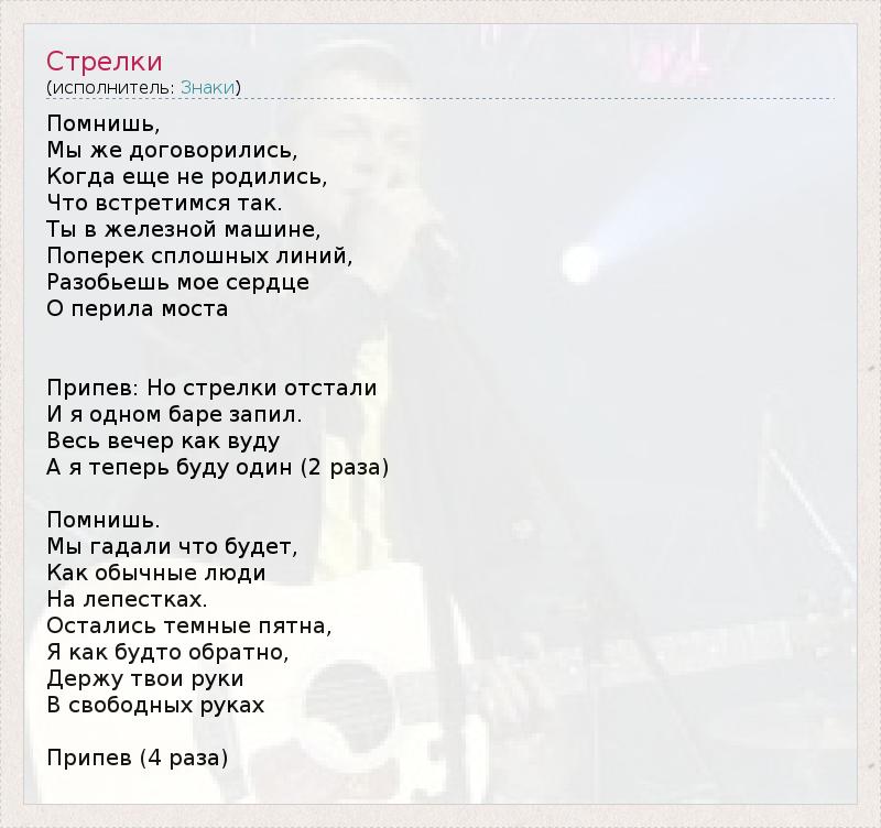 Помнишь, Мы же договорились, Когда еще не родились, Что встретимся так. Ты в железной машине, Поперек сплошных линий, Разобьешь мое сердце О перила моста Припев: Но стрелки отстали И я одном баре запил. Весь вечер как вуду А я теперь буду один (2 раза) Помнишь. Мы гадали что будет, Как обычные люди На лепестках. Остались темные пятна, Я как будто обратно, Держу твои руки В свободных руках Припев (4 раза)