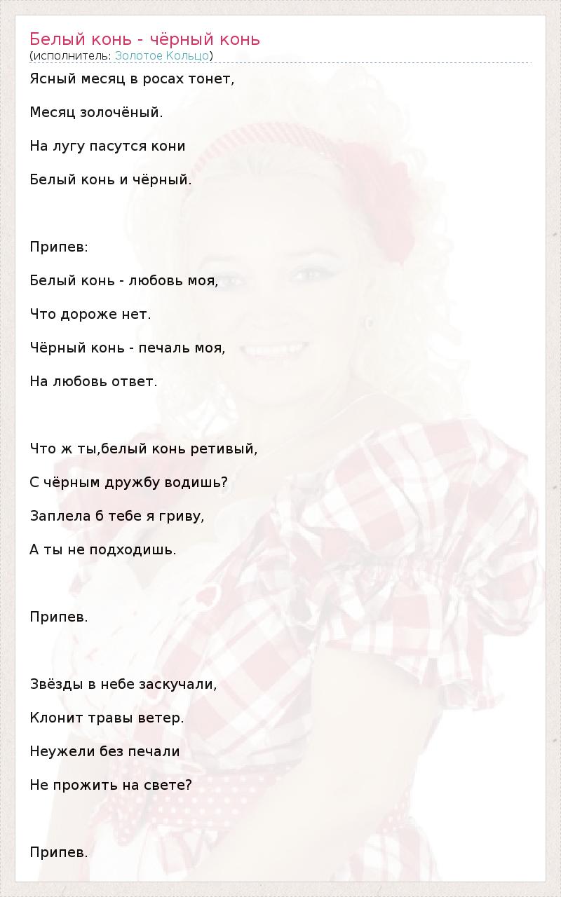 Ясный месяц в росах тонет, Месяц золочёный. На лугу пасутся кони Белый конь и чёрный. Припев: Белый конь - любовь моя, Что дороже нет. Чёрный конь - печаль моя, На любовь ответ. Что ж ты,белый конь ретивый, С чёрным дружбу водишь? Заплела б тебе я гриву, А ты не подходишь. Припев. Звёзды в небе заскучали, Клонит травы ветер. Неужели без печали Не прожить на свете? Припев.