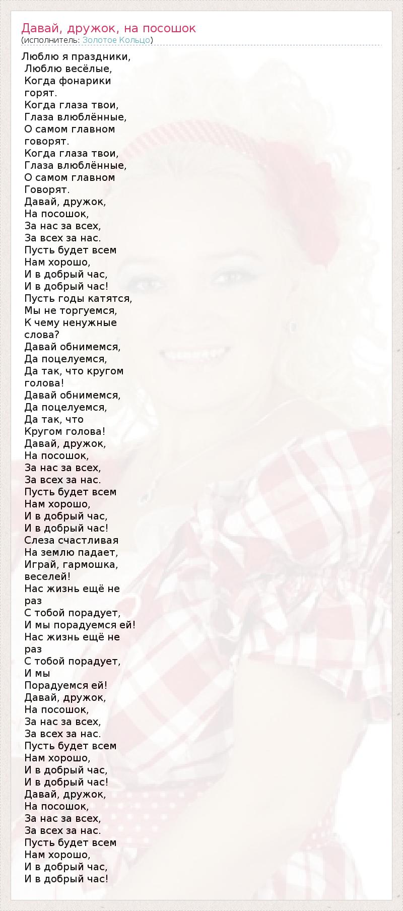 Люблю я праздники, Люблю весёлые, Когда фонарики горят. Когда глаза твои, Глаза влюблённые, О самом главном говорят. Когда глаза твои, Глаза влюблённые, О самом главном Говорят. Давай, дружок, На посошок, За нас за всех, За всех за нас. Пусть будет всем Нам хорошо, И в добрый час, И в добрый час! Пусть годы катятся, Мы не торгуемся, К чему ненужные слова? Давай обнимемся, Да поцелуемся, Да так, что кругом голова! Давай обнимемся, Да поцелуемся, Да так, что Кругом голова! Давай, дружок, На посошок, За нас за всех, За всех за нас. Пусть будет всем Нам хорошо, И в добрый час, И в добрый час! Слеза счастливая На землю падает, Играй, гармошка, веселей! Нас жизнь ещё не раз С тобой порадует, И мы порадуемся ей! Нас жизнь ещё не раз С тобой порадует, И мы Порадуемся ей! Давай, дружок, На посошок, За нас за всех, За всех за нас. Пусть будет всем Нам хорошо, И в добрый час, И в добрый час! Давай, дружок, На посошок, За нас за всех, За всех за нас. Пусть будет всем Нам хорошо, И в добрый час, И в добрый час!