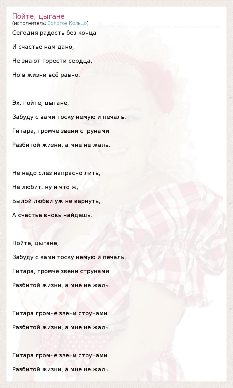 Сегодня радость без конца И счастье нам дано, Не знают горести сердца, Но в жизни всё равно. Эх, пойте, цыгане, Забуду с вами тоску немую и печаль, Гитара, громче звени струнами Разбитой жизни, а мне не жаль. Не надо слёз напрасно лить, Не любит, ну и что ж, Былой любви уж не вернуть, А счастье вновь найдёшь. Пойте, цыгане, Забуду с вами тоску немую и печаль, Гитара, громче звени струнами Разбитой жизни, а мне не жаль. Гитара громче звени струнами Разбитой жизни, а мне не жаль. Гитара громче звени струнами Разбитой жизни, а мне не жаль.