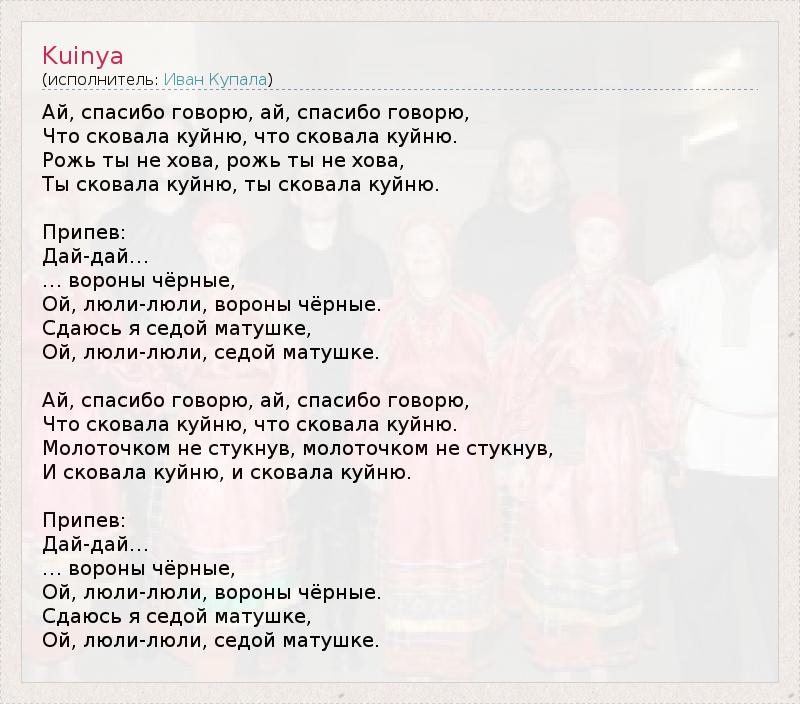 Ай, спасибо говорю, ай, спасибо говорю, Что сковала куйню, что сковала куйню. Рожь ты не хова, рожь ты не хова, Ты сковала куйню, ты сковала куйню. Припев: Дай-дай… … вороны чёрные, Ой, люли-люли, вороны чёрные. Сдаюсь я седой матушке, Ой, люли-люли, седой матушке. Ай, спасибо говорю, ай, спасибо говорю, Что сковала куйню, что сковала куйню. Молоточком не стукнув, молоточком не стукнув, И сковала куйню, и сковала куйню. Припев: Дай-дай… … вороны чёрные, Ой, люли-люли, вороны чёрные. Сдаюсь я седой матушке, Ой, люли-люли, седой матушке.
